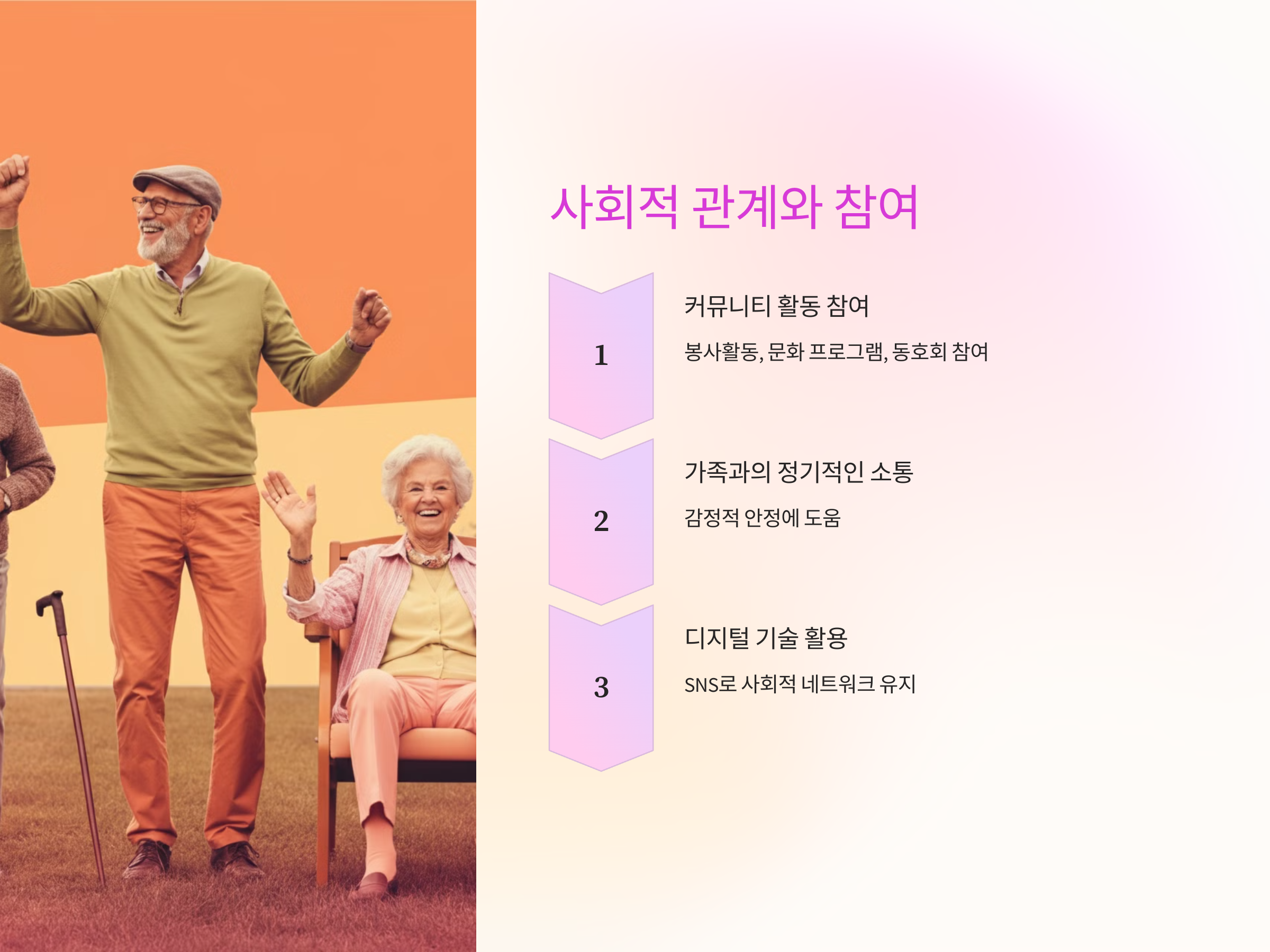- 디지털 기술 활용: 스마트폰과 SNS를 통해 사회적 네트워크를 유지하고 새로운 관계를 맺어보세요.