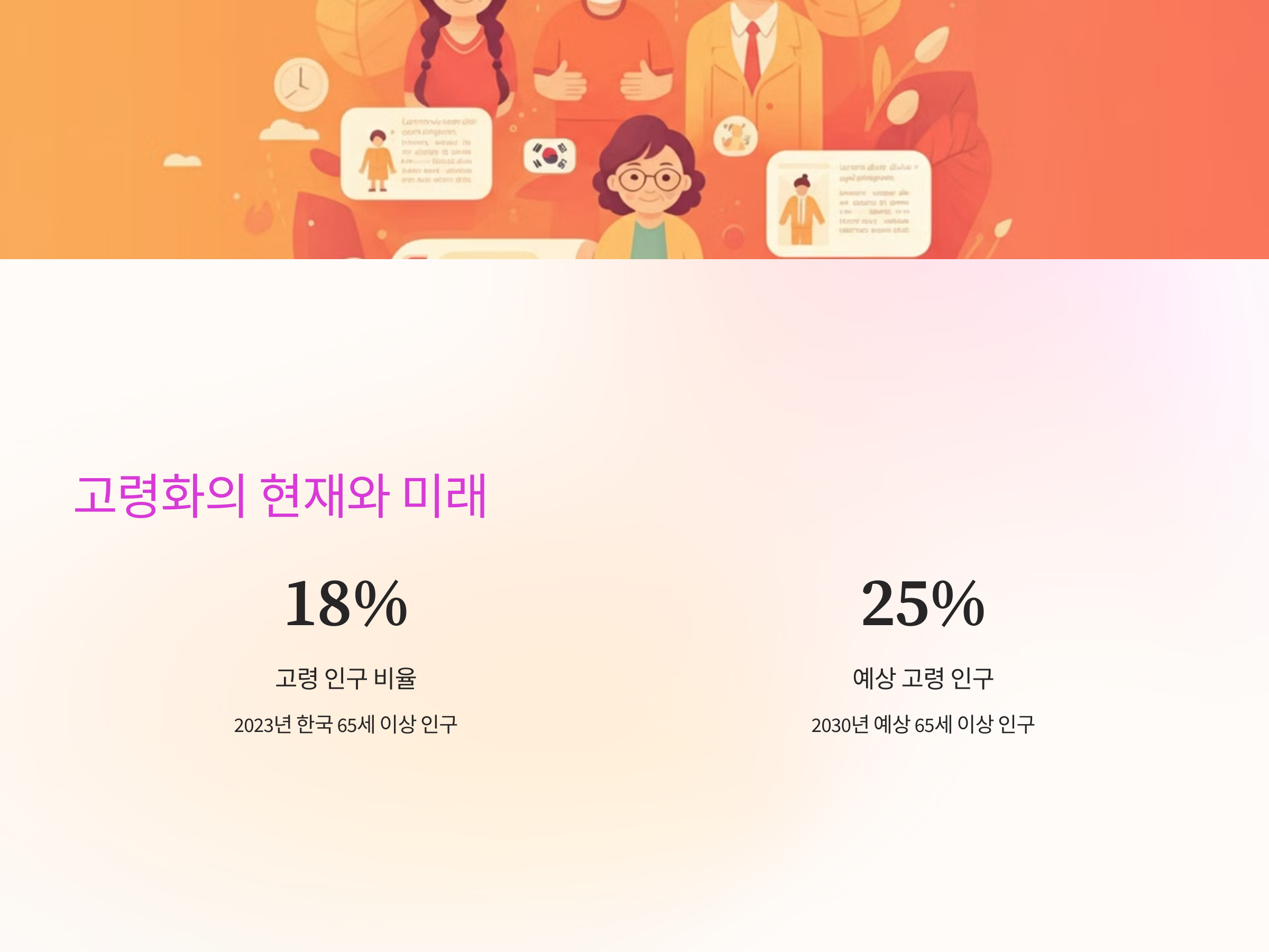 고령화는 전 세계적으로 공통된 현상으로, 특히 한국은 세계에서 가장 빠르게 고령화가 진행되는 국가 중 하나입니다. 2023년 통계에 따르면 한국의 65세 이상 고령 인구는 전체 인구의 약 18%에 달했으며, 2030년에는 이 비율이 25%를 넘을 것으로 예상됩니다. 이러한 변화는 노동력 감소, 연금 시스템의 부담 증가, 의료비용 급등 등 다양한 사회적 문제를 초래하고 있습니다.