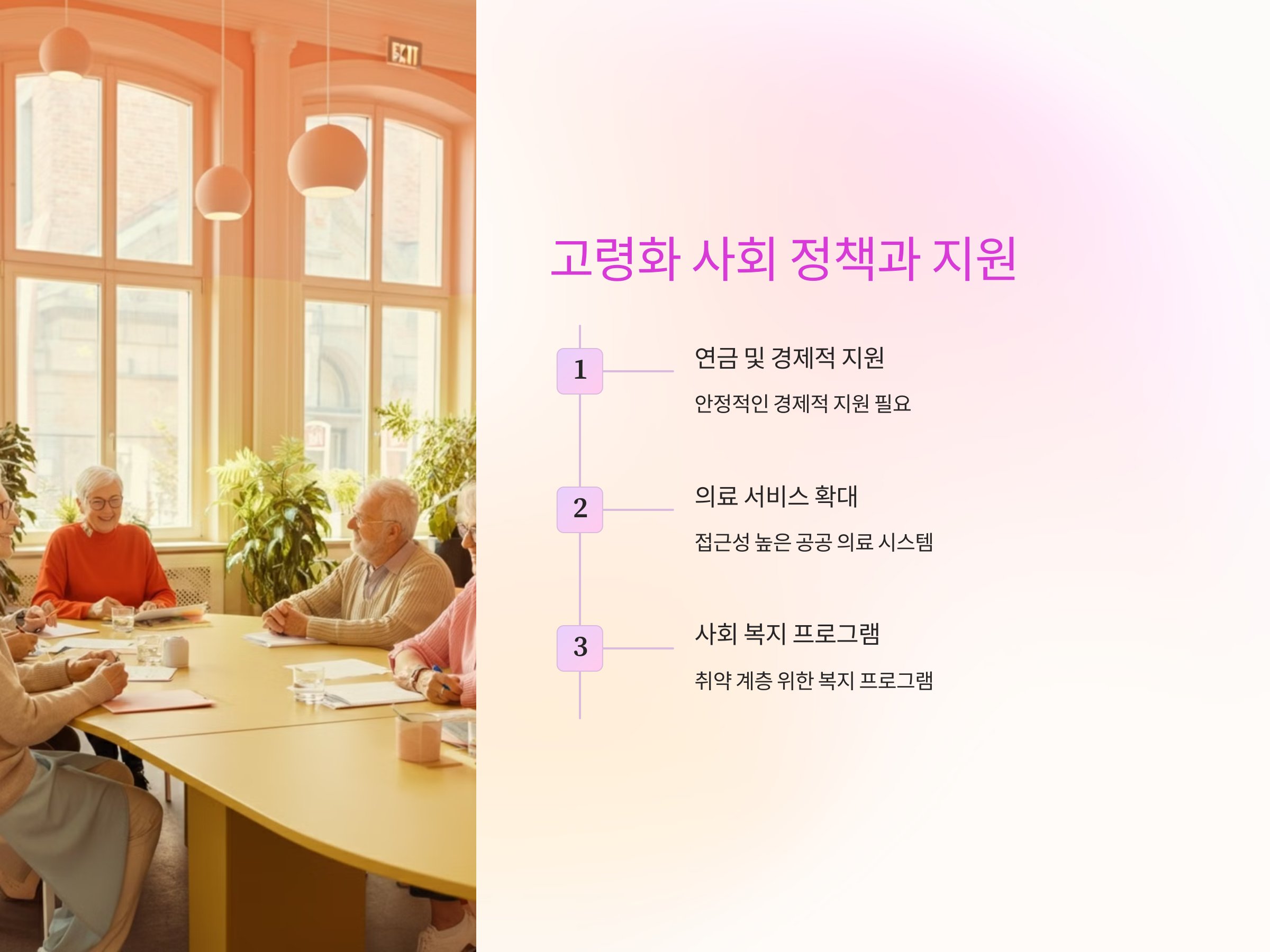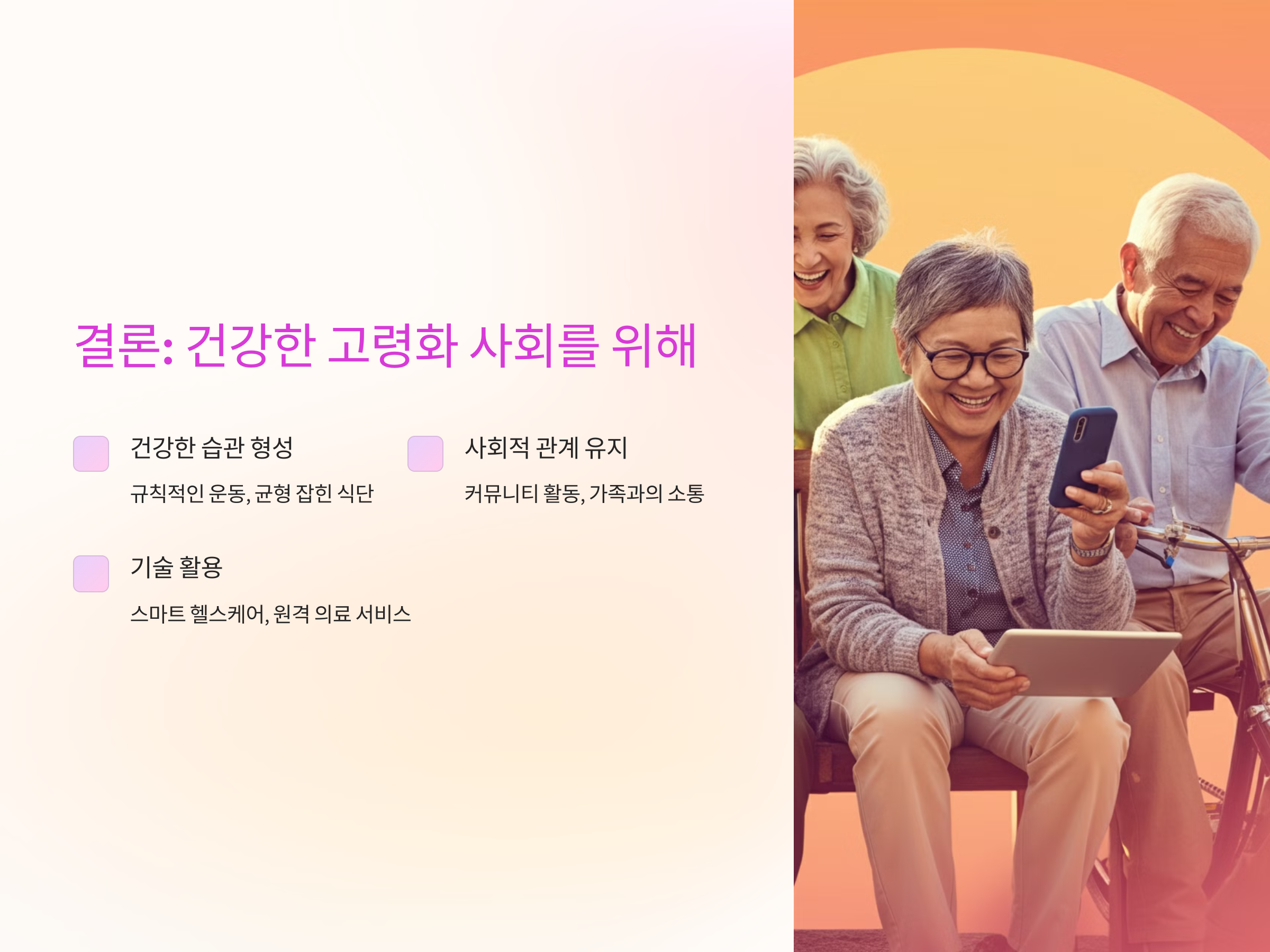 고령화에 대응하기 위해 개인적인 노력뿐 아니라, 사회적 차원의 정책과 지원도 중요합니다.