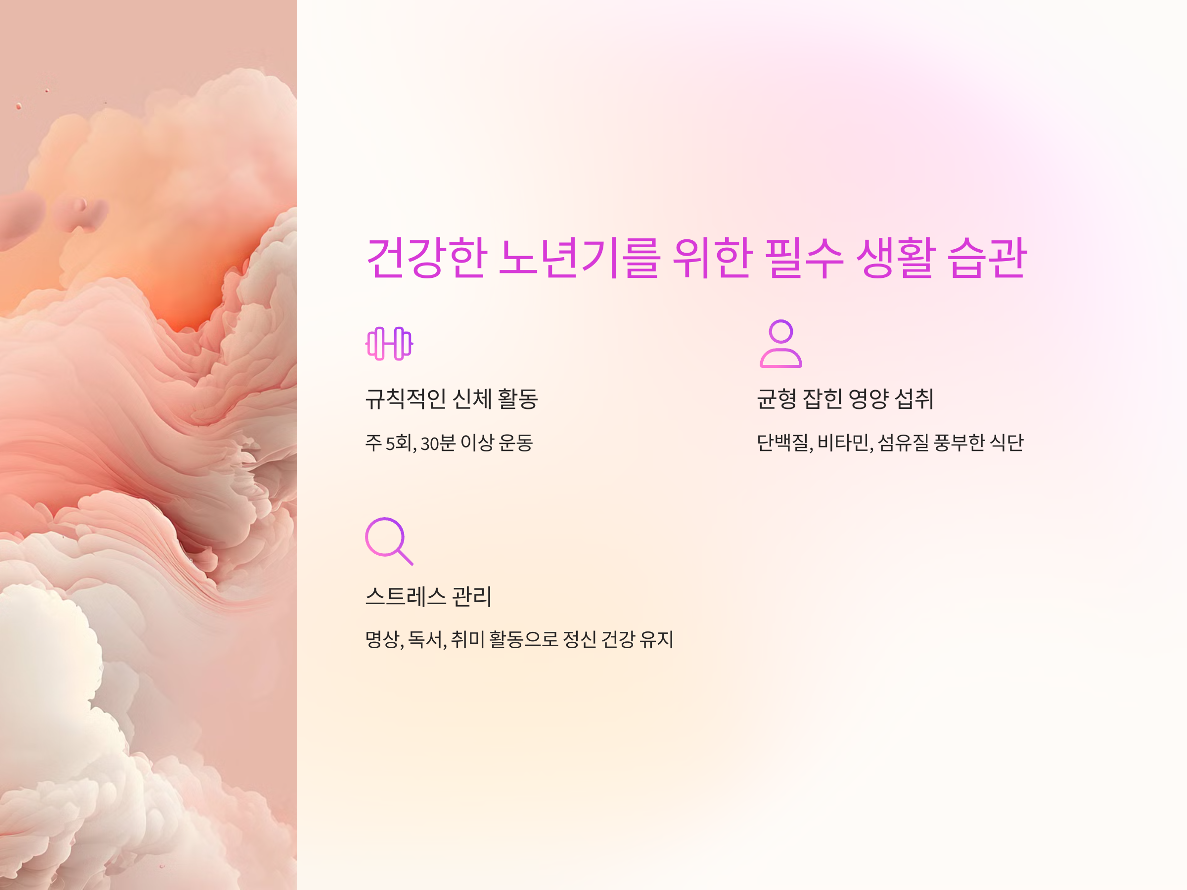 건강한 노년기를 위해 가장 중요한 것은 꾸준한 건강 관리입니다. 일상에서 실천할 수 있는 몇 가지 핵심 습관을 소개합니다.