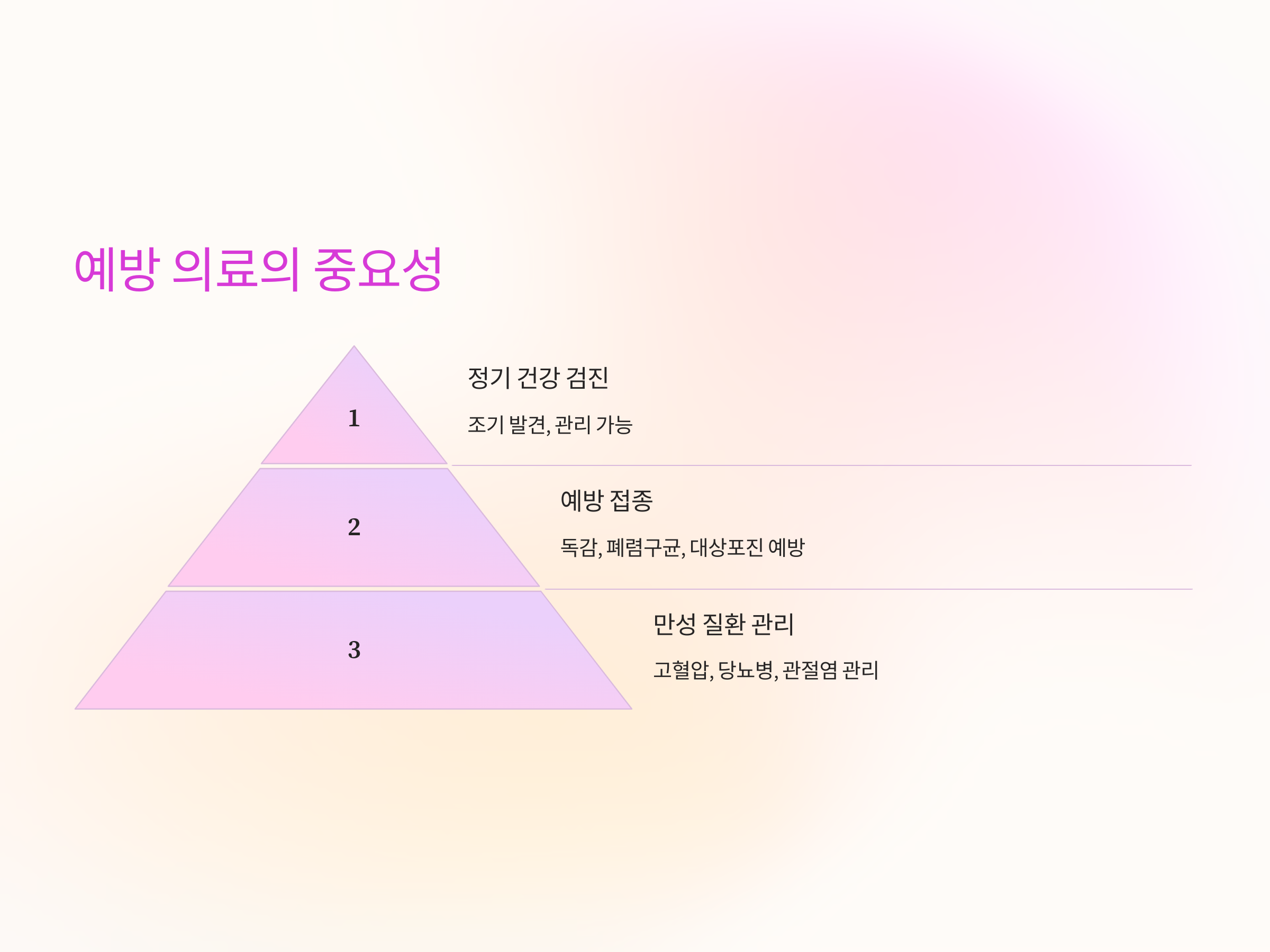 정기적인 건강 검진과 예방적 의료 조치는 고령화 시대의 필수 요소입니다. 특히, 다음과 같은 분야에 집중하면 많은 질병을 조기에 발견하고 관리할 수 있습니다.