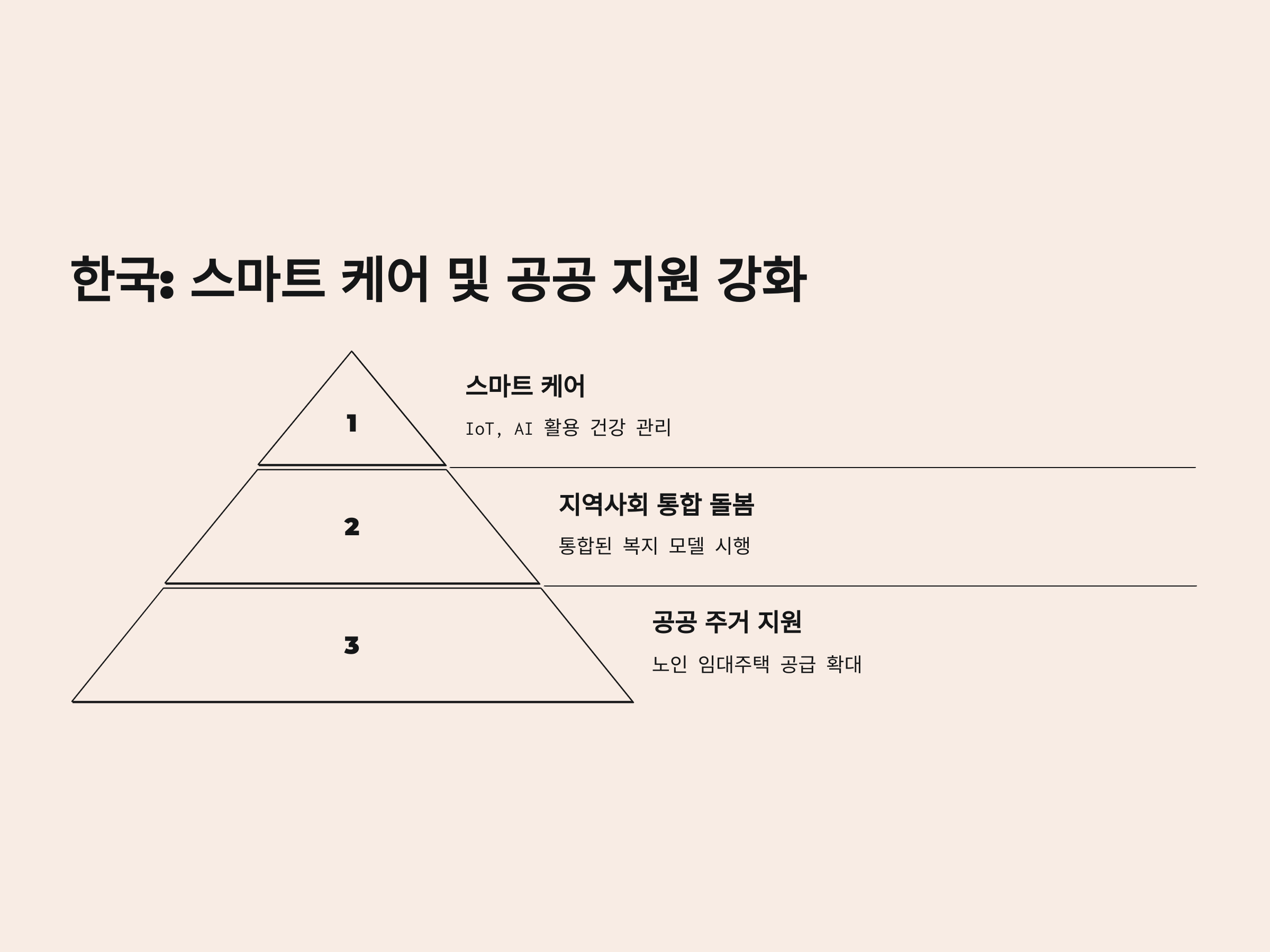 한국은 빠르게 고령화가 진행되는 국가 중 하나로, 기술을 활용한 스마트 케어 솔루션과 다양한 공공 지원 정책을 도입하고 있습니다.