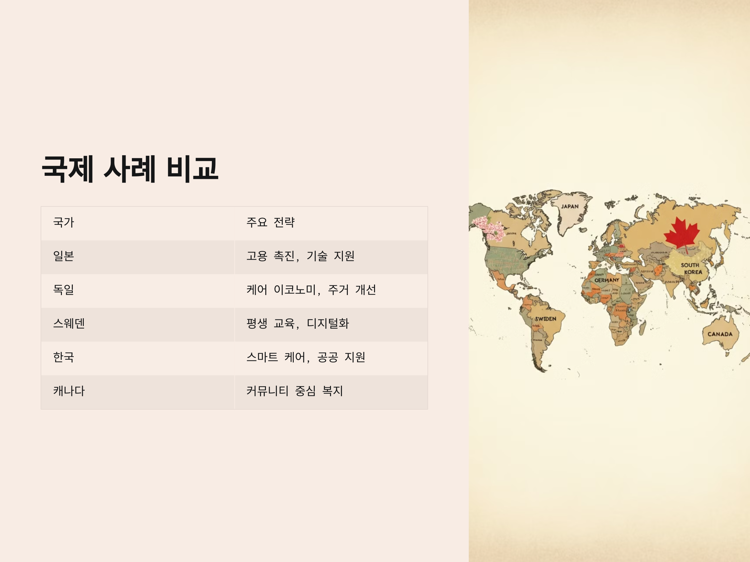 아래에서는 주요 국가들이 채택한 고령화 대응 방안을 자세히 살펴봅니다.