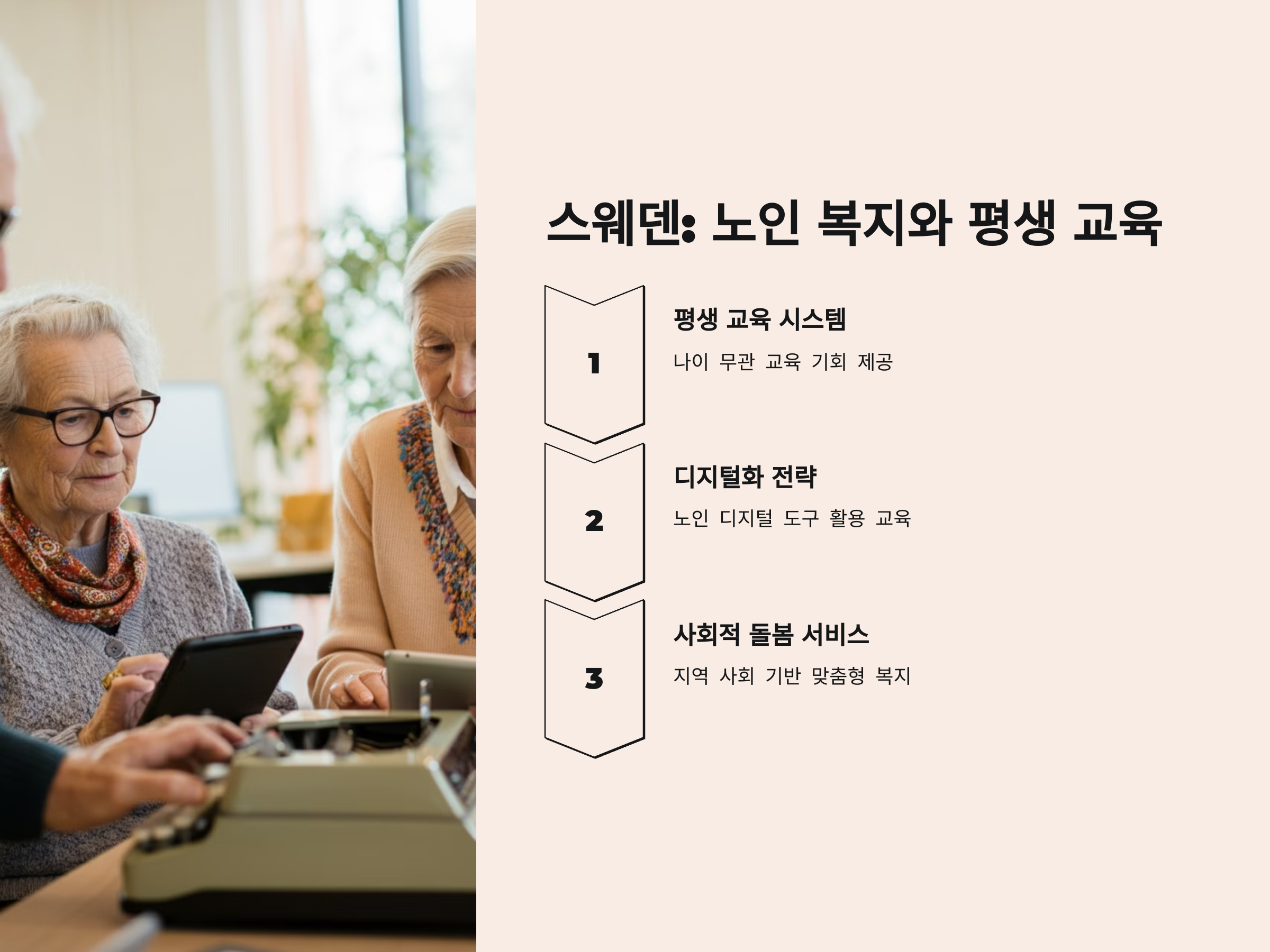 스웨덴은 노인들의 사회적 고립을 방지하고, 지속적으로 학습할 수 있는 환경을 제공하는 데 중점을 둡니다.