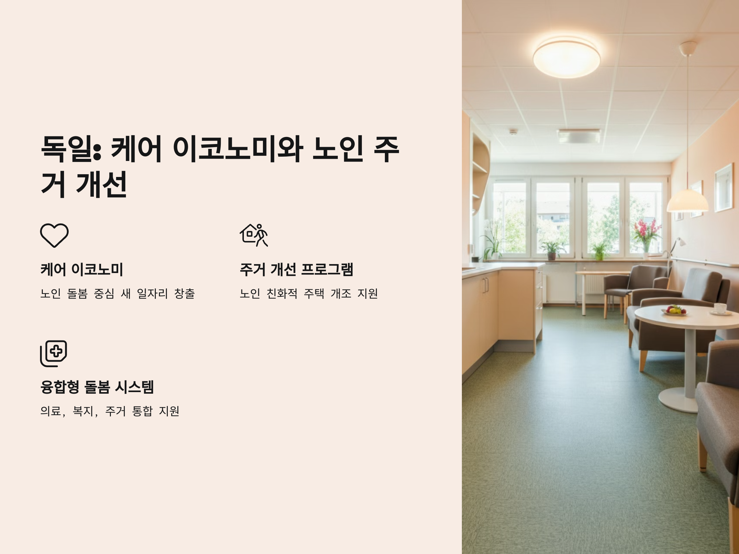 독일은 고령화로 인한 사회적 부담을 줄이기 위해 케어 이코노미(Care Economy)와 노인 친화적 주거 개선 프로젝트를 도입했습니다.