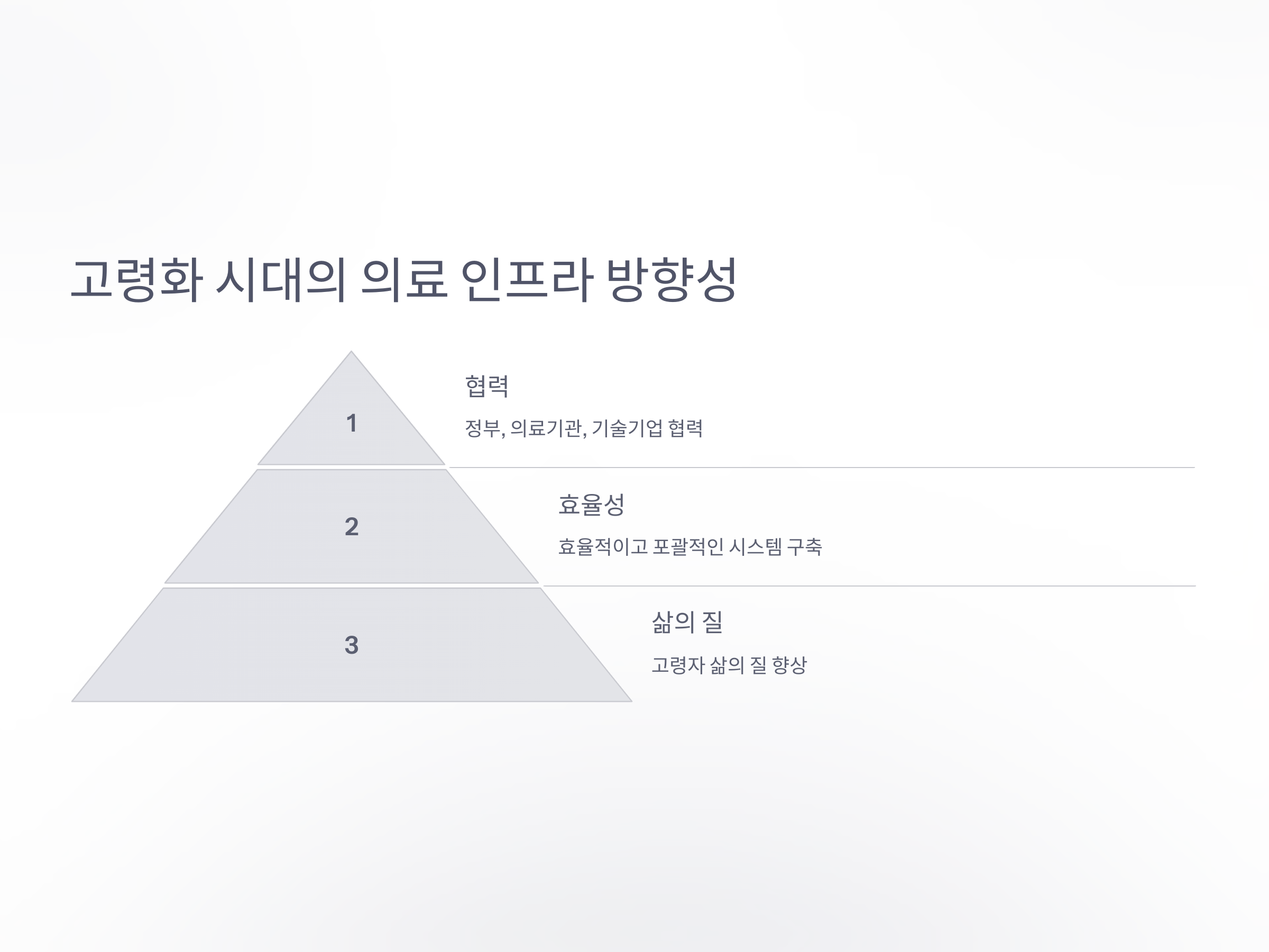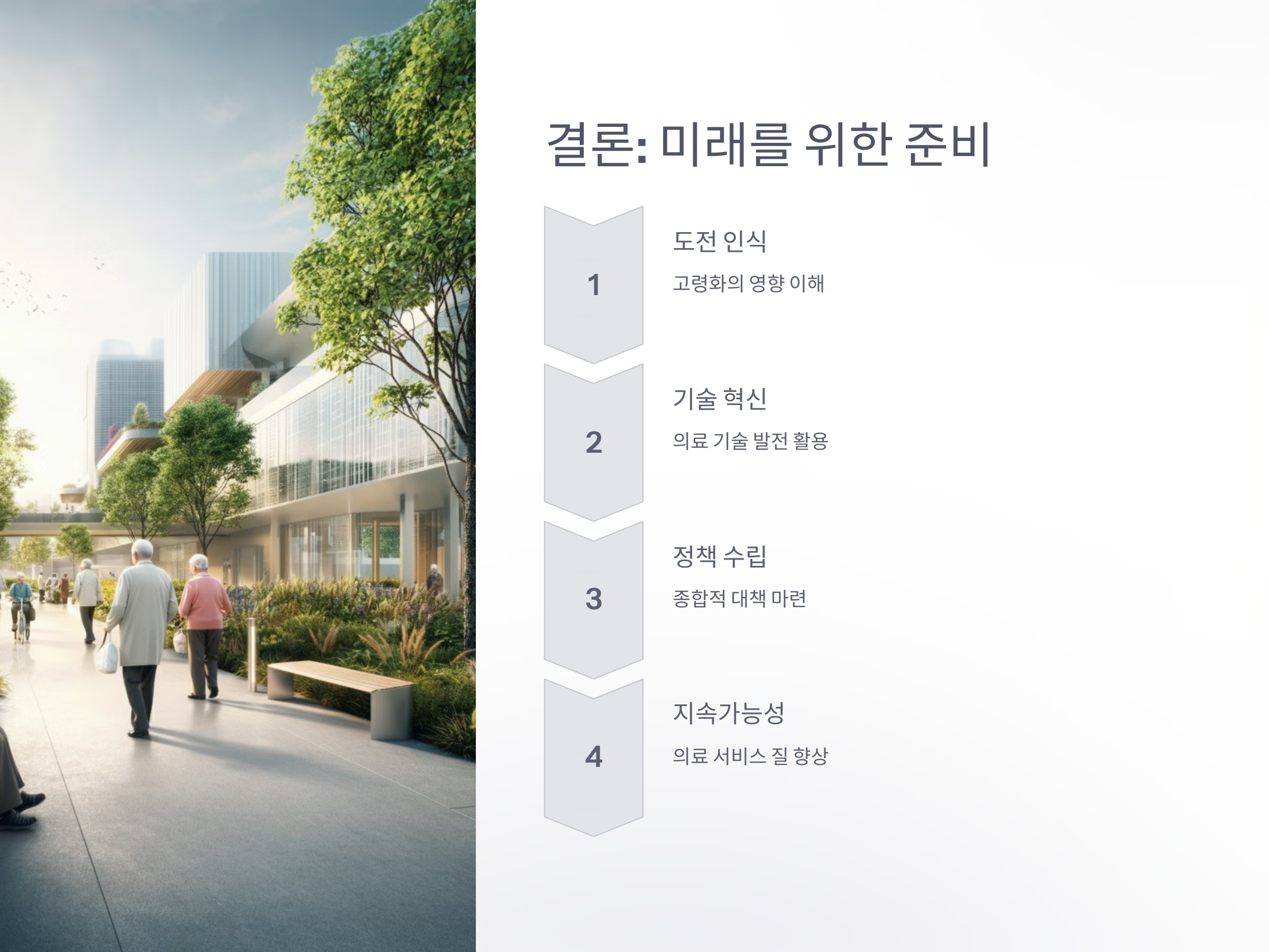 고령화는 의료 인프라에 큰 도전을 가져오지만, 동시에 효율적이고 포괄적인 시스템을 구축할 기회이기도 합니다. 정부, 의료 기관, 기술 기업이 협력하여 고령화에 대비한 종합적인 대책을 마련해야 합니다. 이를 통해 의료 서비스의 질을 높이고, 고령자의 삶의 질을 향상시킬 수 있을 것입니다
