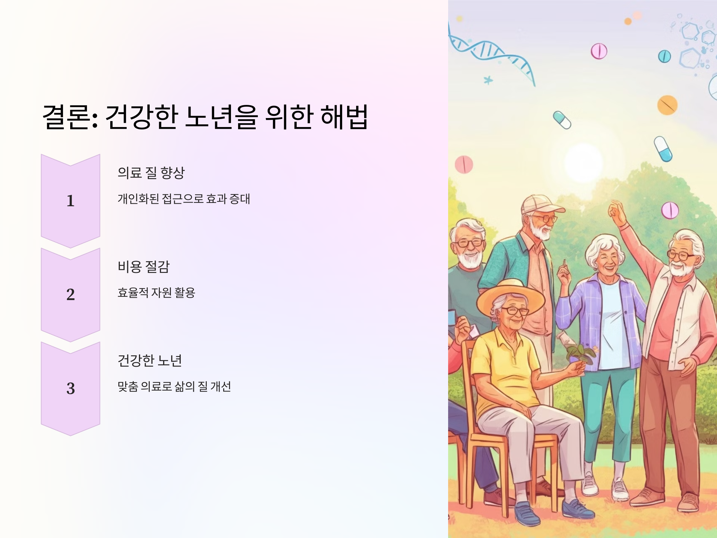 고령화는 현대 사회가 직면한 가장 큰 도전 중 하나이지만, 동시에 신약 개발을 통해 해결할 수 있는 기회를 제공합니다. 생명공학, AI, 유전자 치료 등의 기술이 발전함에 따라 고령화로 인한 문제를 해결할 가능성은 더욱 커지고 있습니다. 의료와 기술의 협력을 통해 우리는 더욱 건강하고 풍요로운 노년을 기대할 수 있습니다