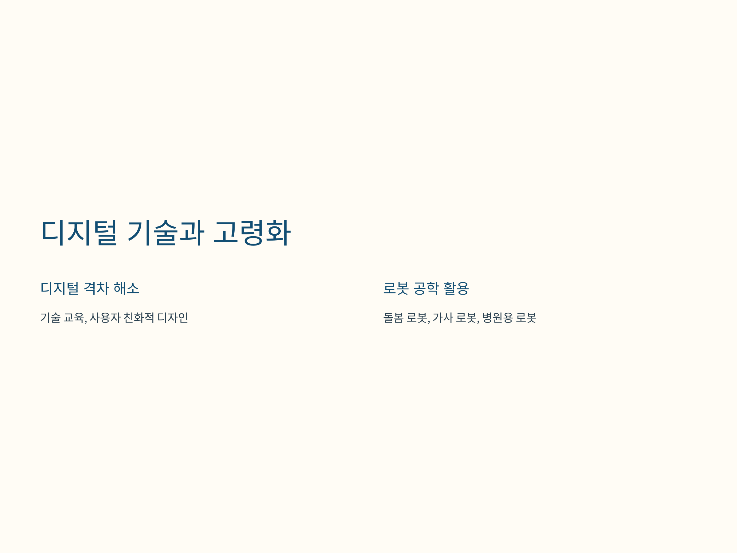디지털 기술, AI, 로봇 공학은 고령층의 생활을 보다 독립적이고 안전하게 만들어 줍니다. 이 기술들은 사회적 통합을 돕는 동시에 경제적 효율성을 높입니다.