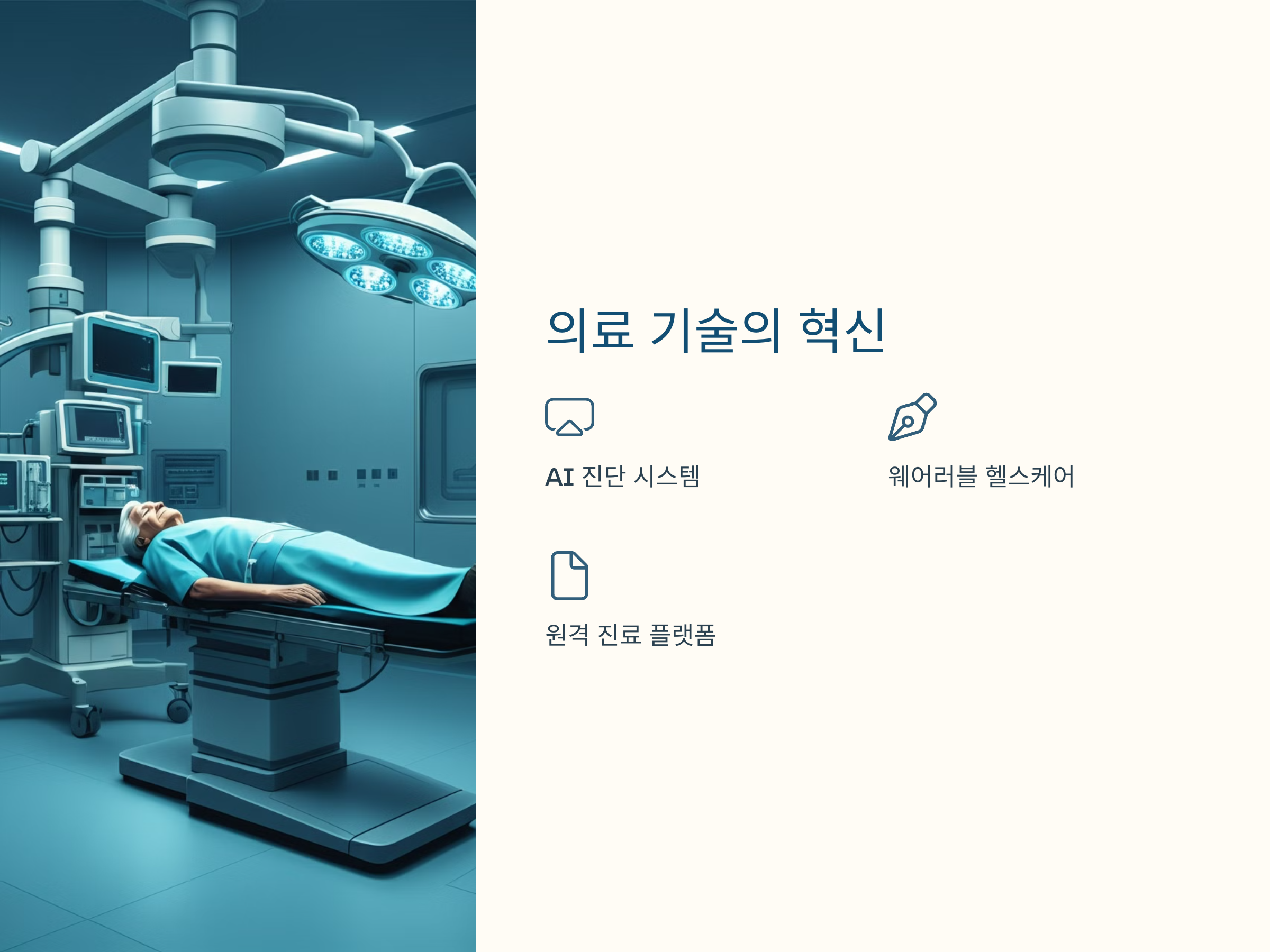 고령 인구가 증가함에 따라, 맞춤형 의료 기술은 핵심 산업으로 자리 잡고 있습니다. AI 기반 진단 시스템, 웨어러블 헬스케어 기기, 원격 진료 플랫폼은 고령화 시대에 필수적인 솔루션으로 주목받고 있습니다. 이 기술들은 의료 비용을 절감하면서도 더 나은 건강 관리를 제공합니다.