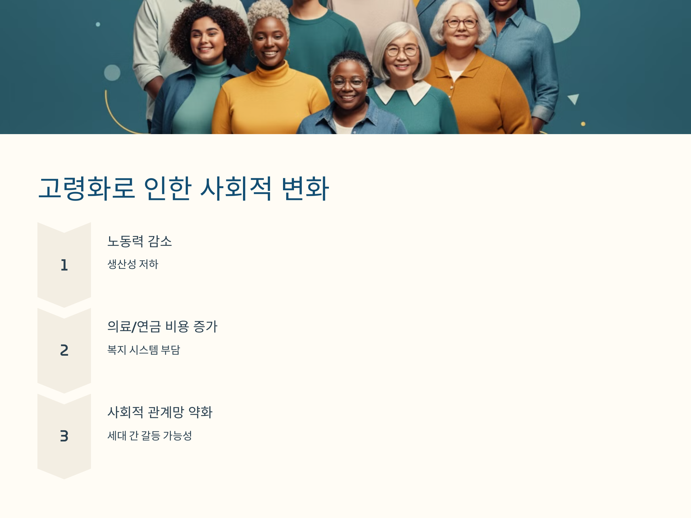 고령화는 노동력 감소로 인한 생산성 저하와 의료 및 연금 비용 증가를 가져옵니다. 또한 고령화로 인해 사회적 관계망이 약화되고, 세대 간 갈등이 심화될 가능성도 있습니다. 이를 해결하기 위해서는 복지 시스템의 재구성과 기술을 활용한 효율성 증대가 필수적입니다.