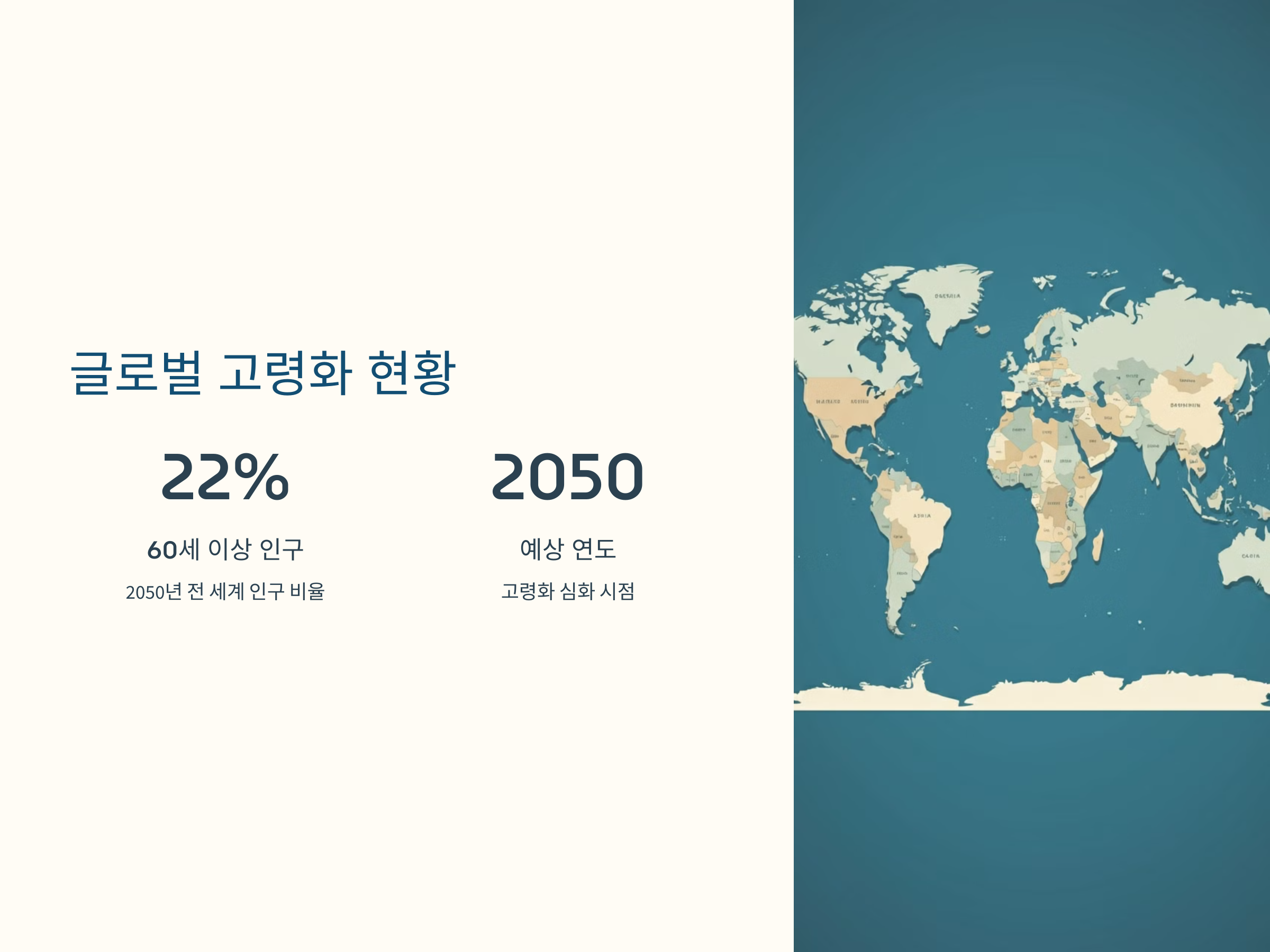 고령화는 전 세계적으로 공통된 문제로 자리 잡았습니다. UN에 따르면, 2050년에는 전 세계 인구의 22%가 60세 이상이 될 것으로 예상됩니다. 특히 일본, 독일 등 선진국에서는 이미 고령화 속도가 빠르게 진행 중이며, 개발도상국도 같은 문제를 겪고 있습니다.