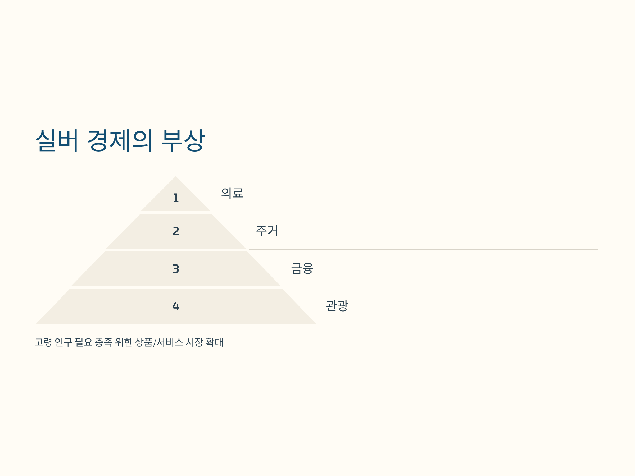 고령화는 새로운 시장을 창출합니다. 실버 경제(Silver Economy)는 고령 인구의 필요를 충족하기 위한 상품과 서비스로 구성됩니다. 의료, 주거, 금융, 관광 등 다양한 산업에서 실버 세대를 타겟으로 한 시장이 확대되고 있습니다.