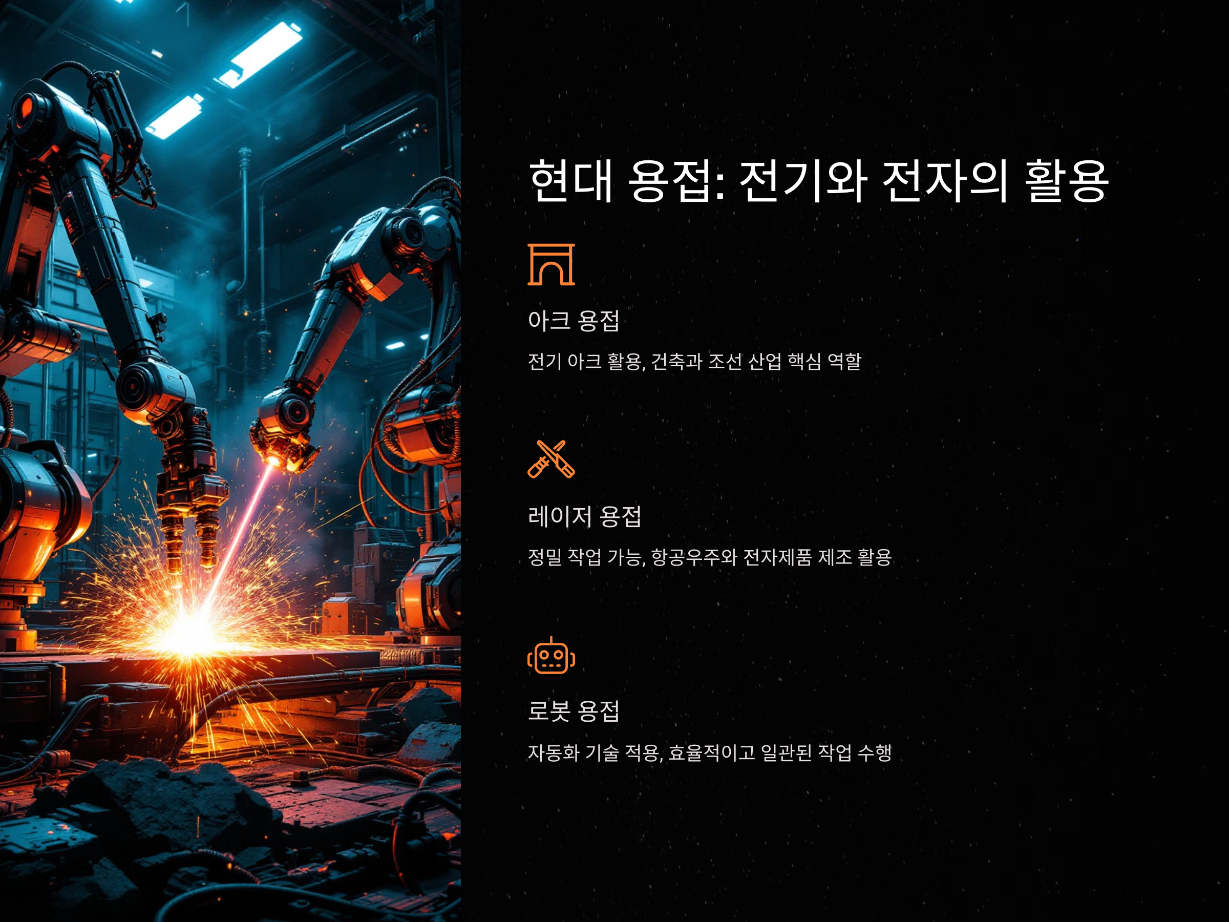 - 아크 용접: 20세기 초, 전기 아크(Arc)를 활용한 용접 기술이 대중화되었습니다. 이는 건축과 조선 산업에서 핵심 역할을 했습니다.