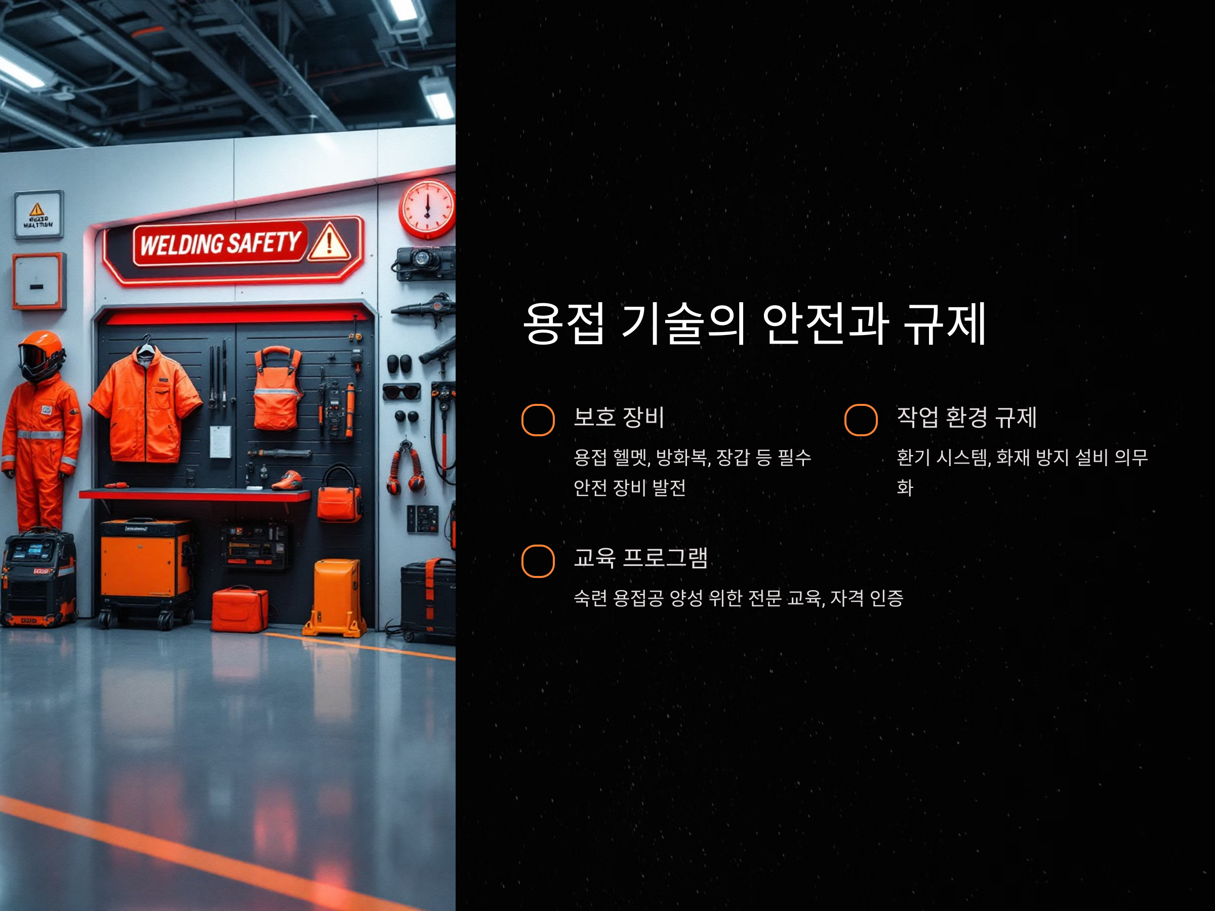 - 보호 장비: 용접 헬멧, 방화복, 장갑 등 필수 안전 장비의 발전.