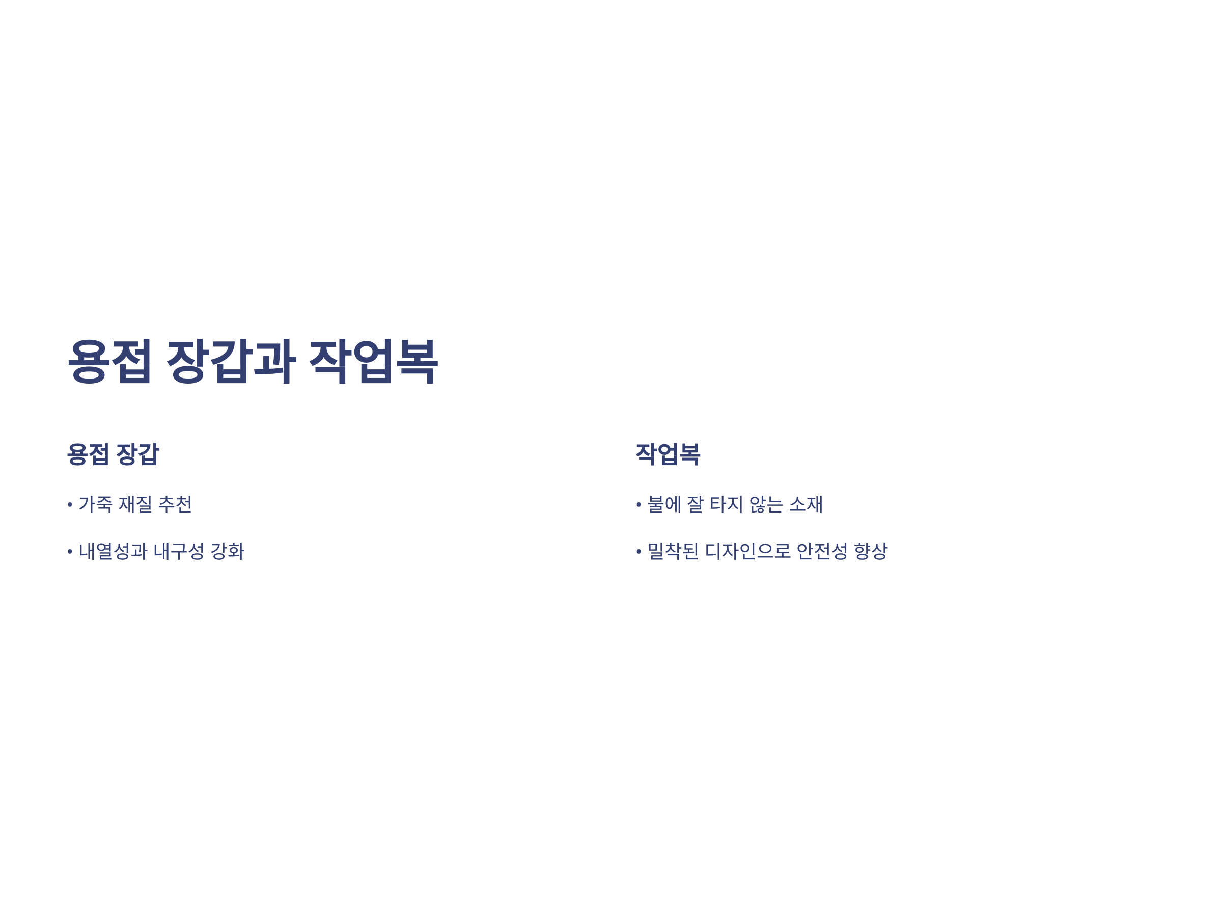 - 열과 화염: 고온 작업으로 화상 및 피부 손상이 발생할 위험이 큽니다.