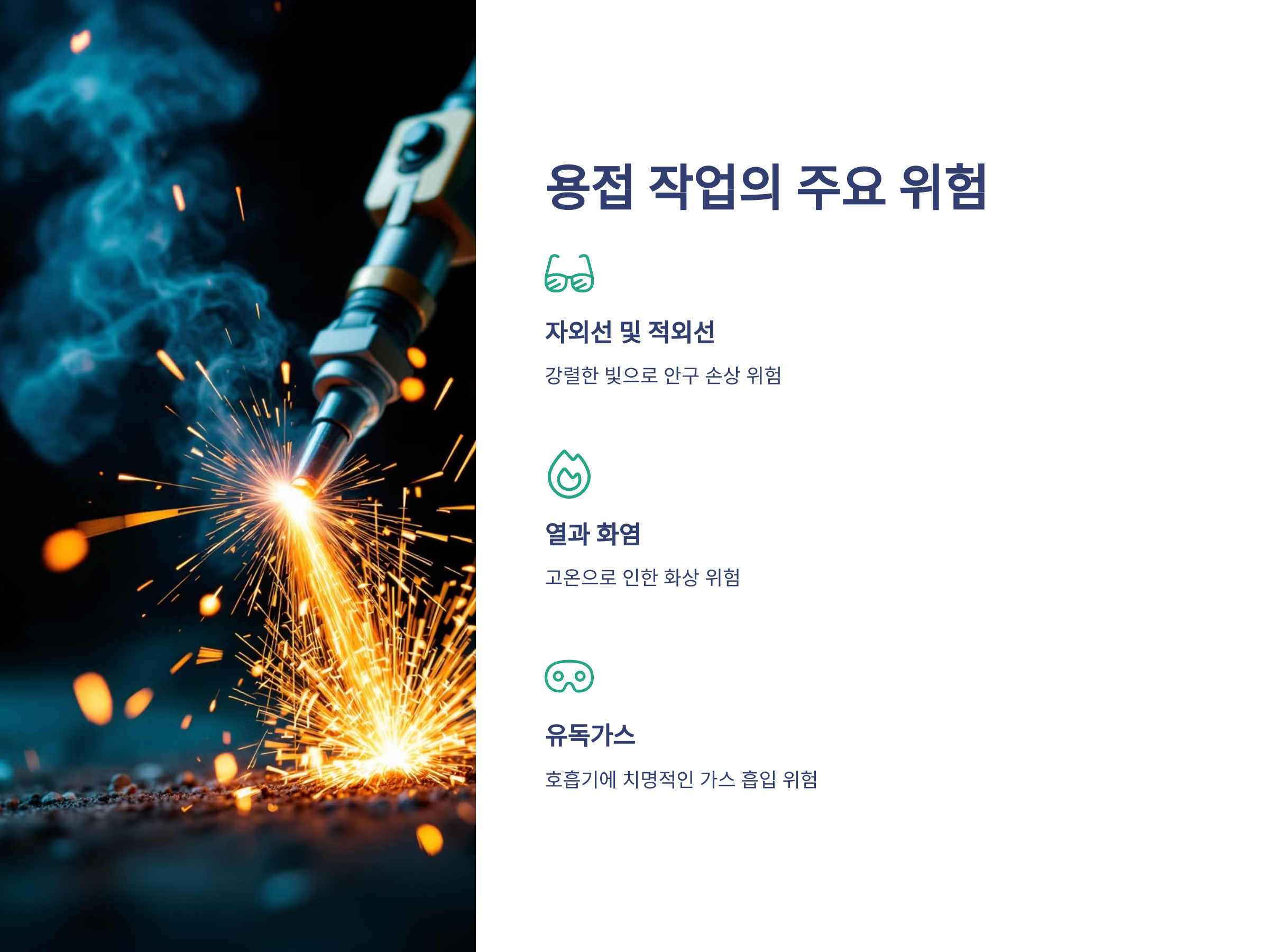 - 자외선 및 적외선 노출: 용접 시 발생하는 강렬한 빛은 심각한 안구 손상을 초래할 수 있습니다.