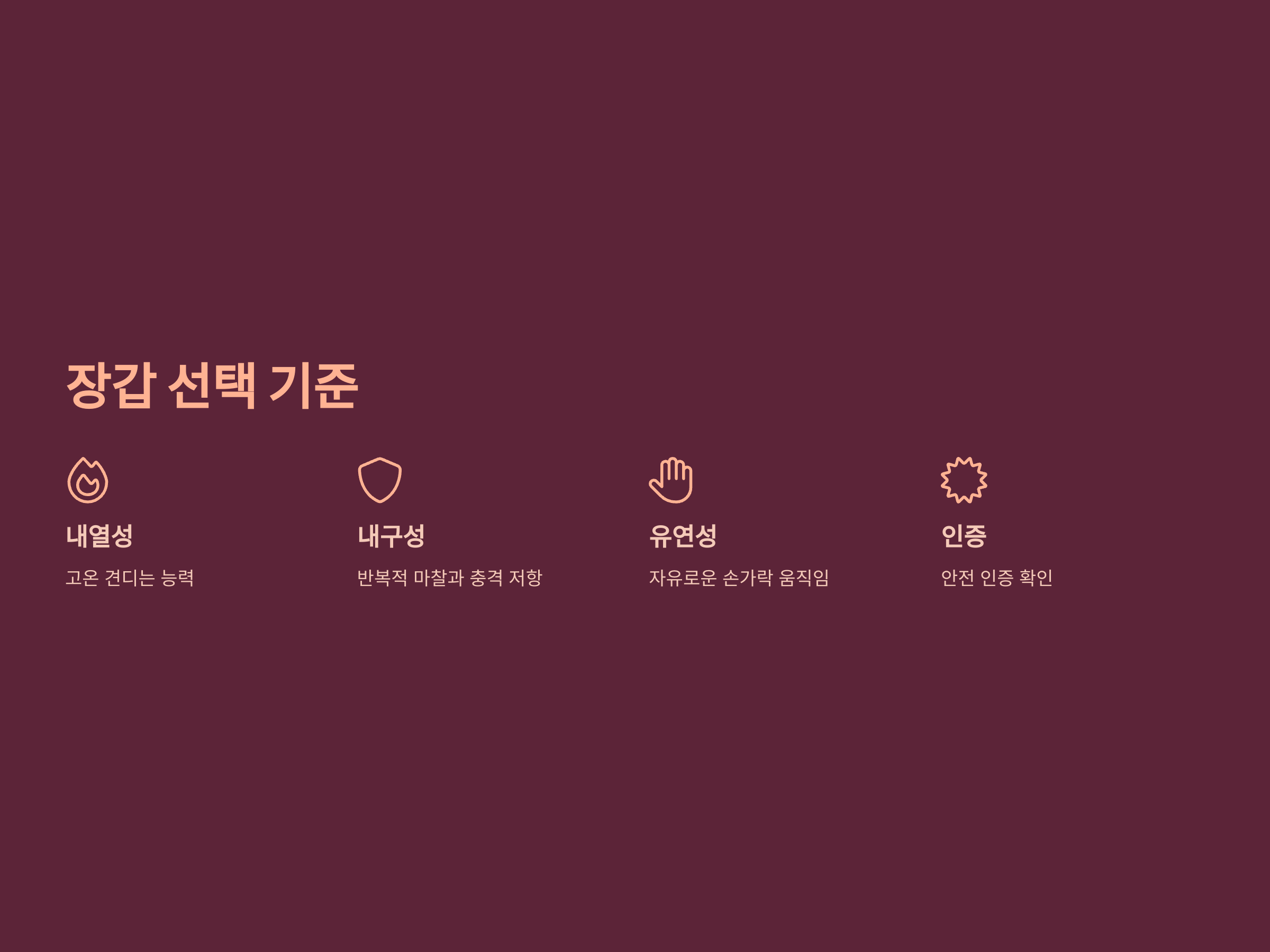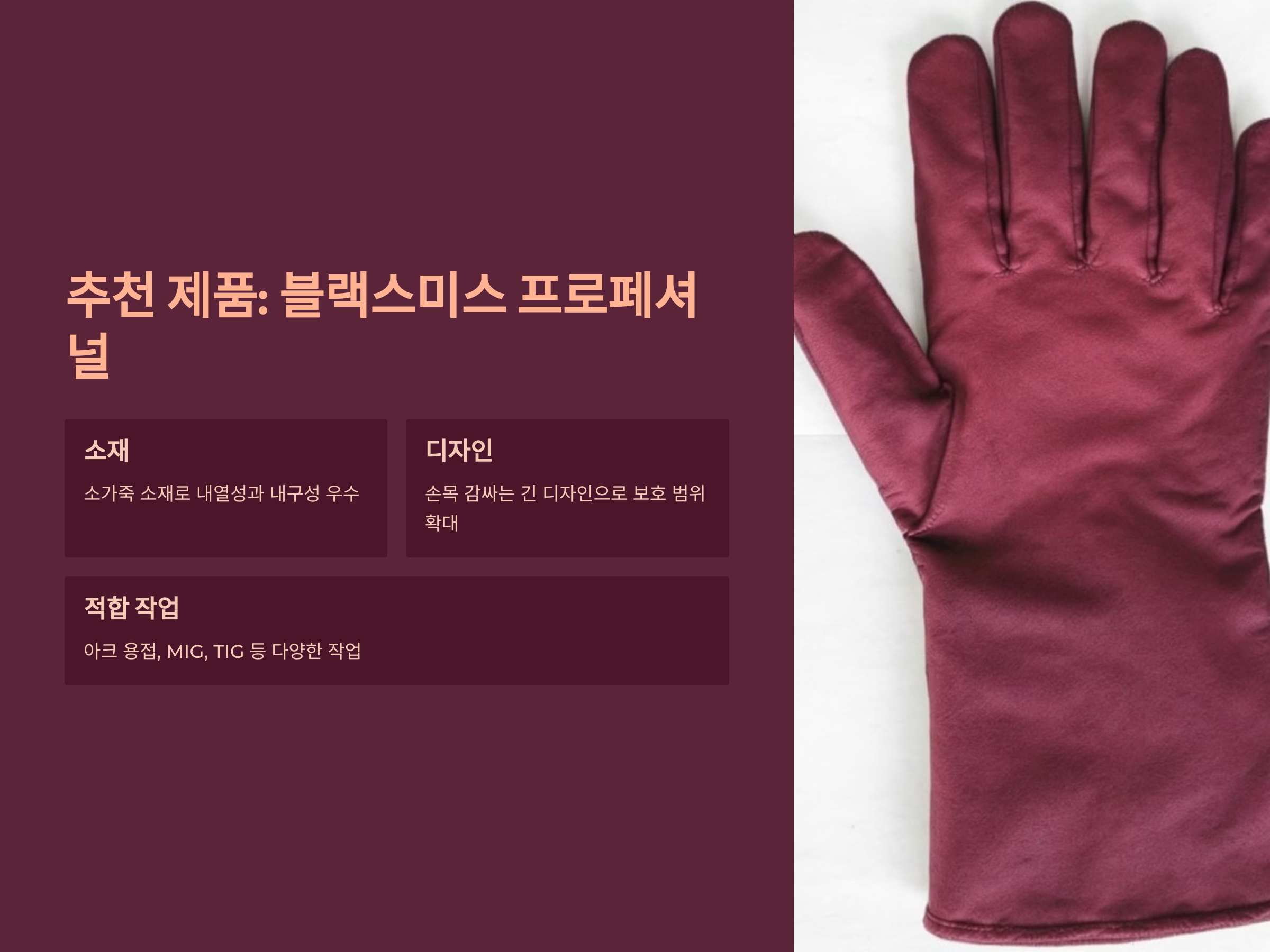 - 소재: 소가죽, 염소가죽, 내열성 섬유 등 용도에 적합한 소재.