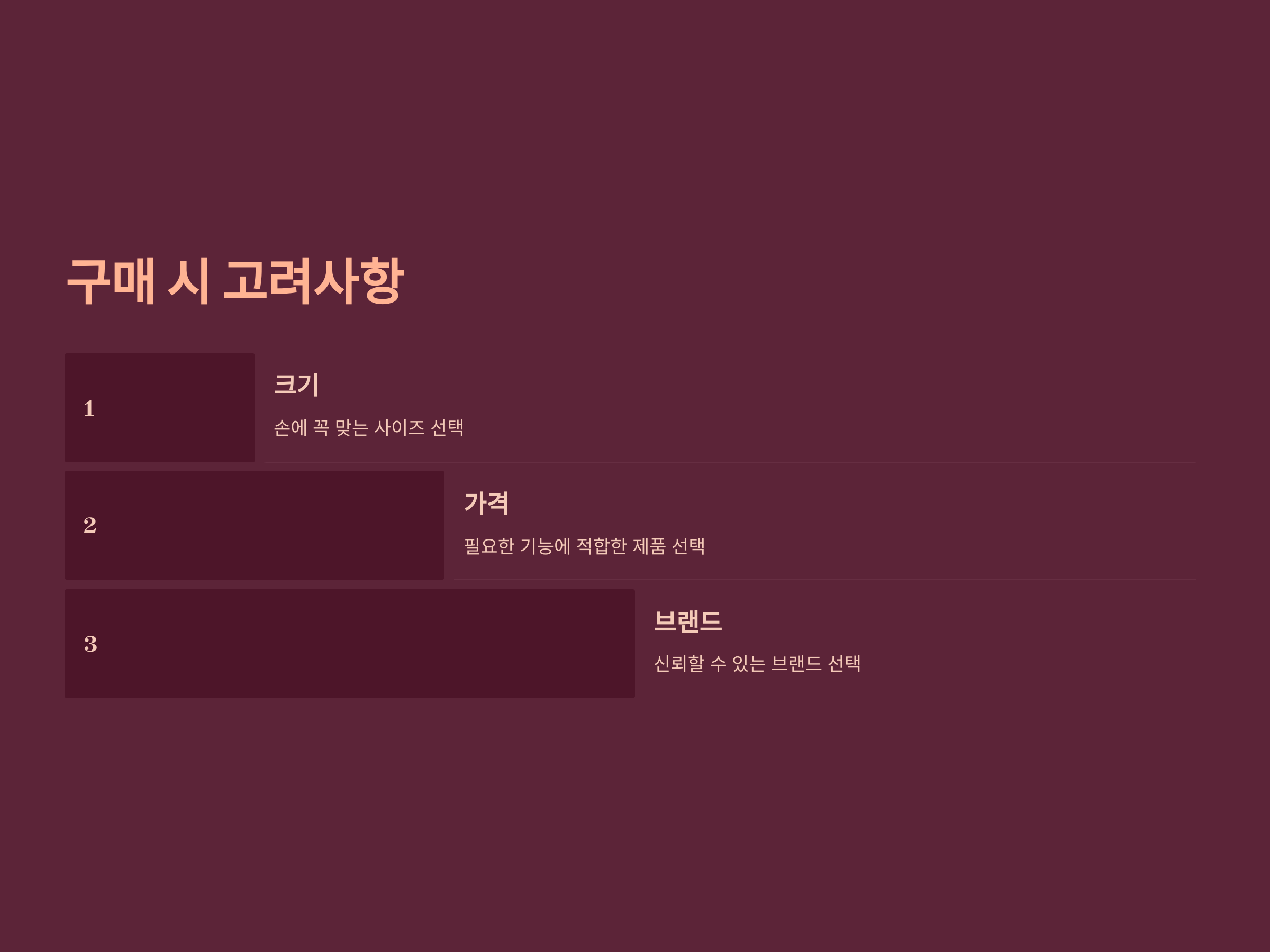 - 브랜드: 신뢰할 수 있는 브랜드는 사후 관리도 용이합니다.