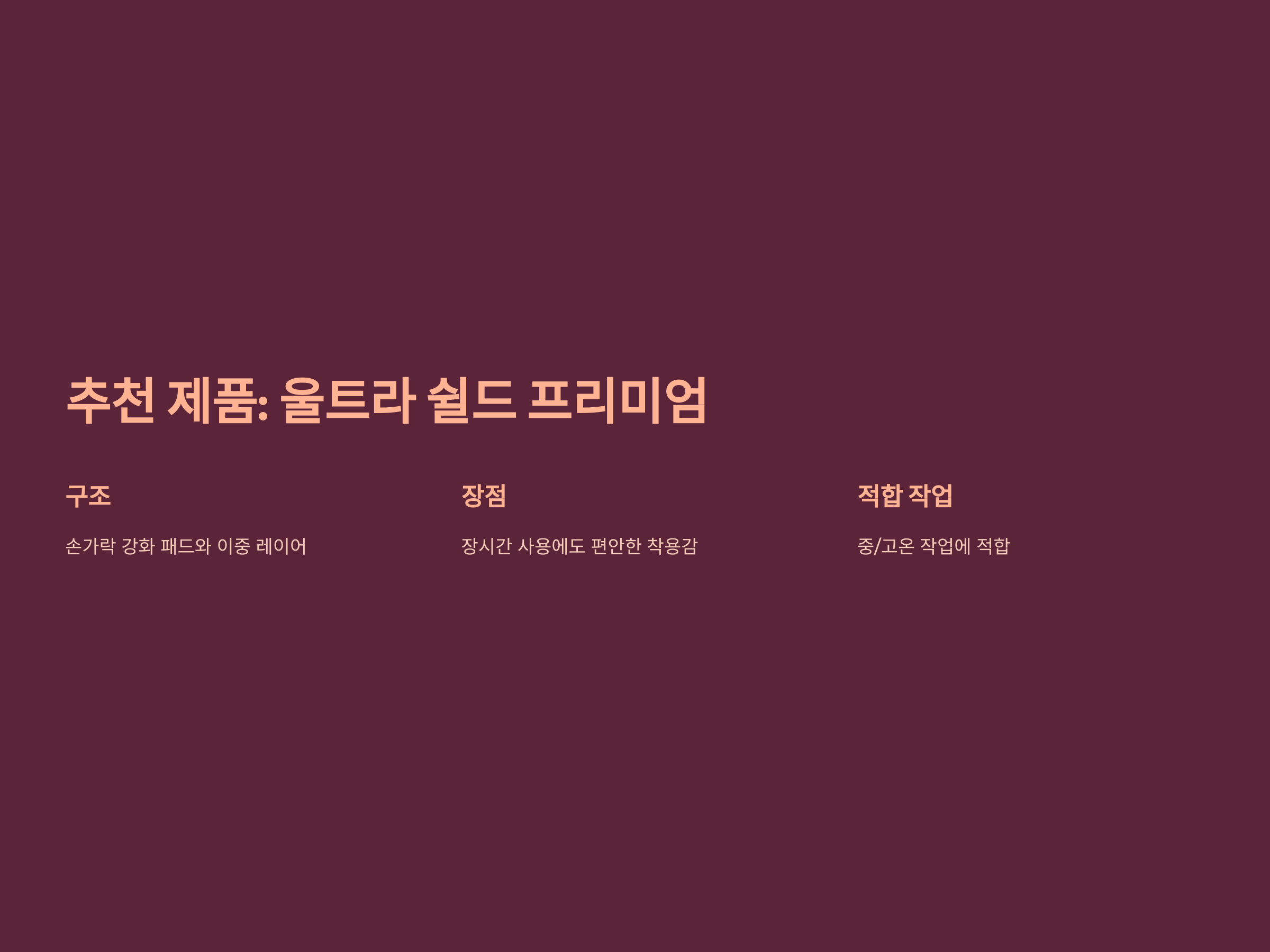 - 내구성: 반복적인 마찰과 충격에도 오래 사용할 수 있는 장갑.