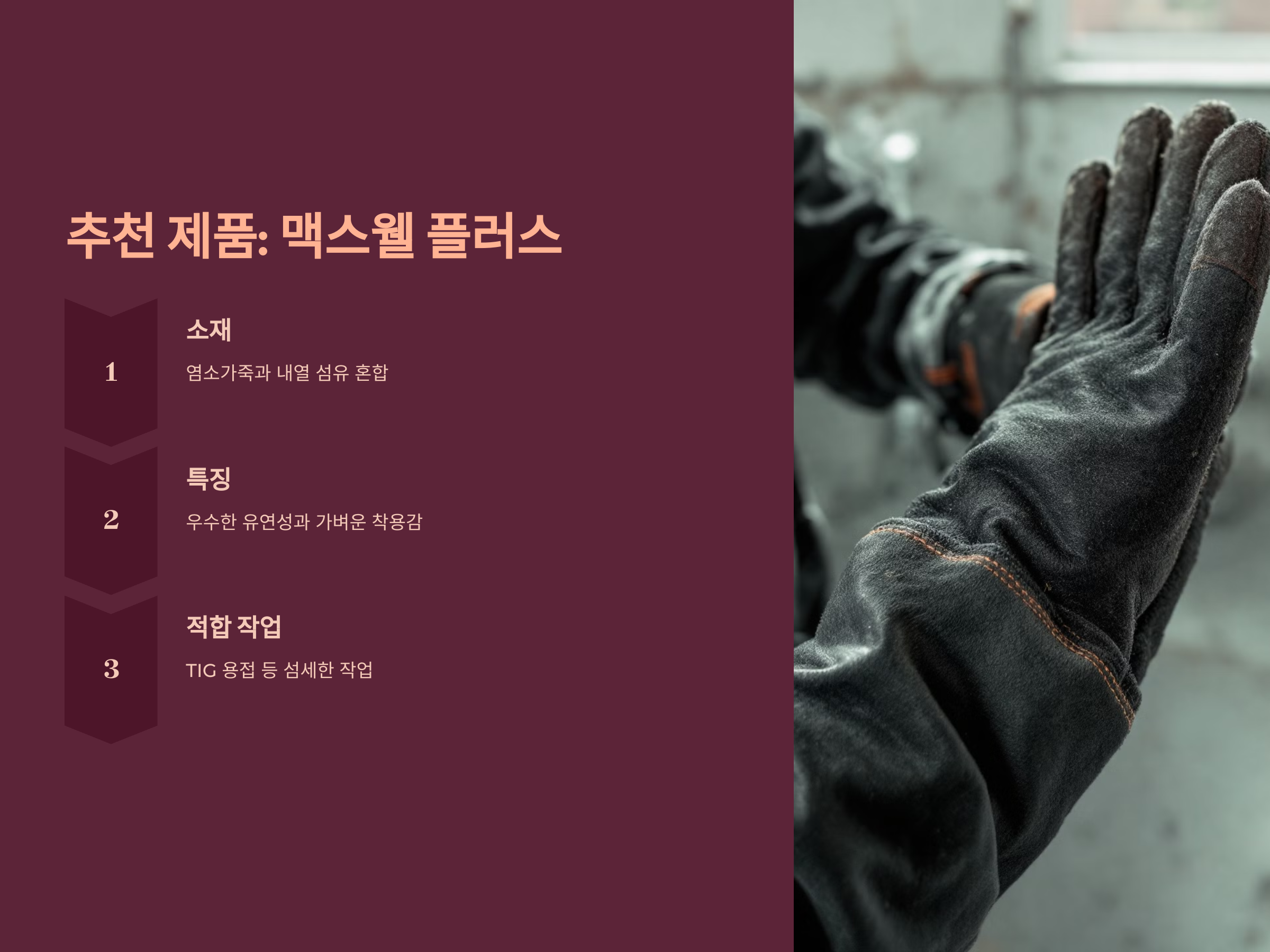 용접 작업은 손과 손목 부위에 높은 열과 스파크를 유발합니다. 따라서 장갑 선택 시 다음 요소를 고려해야 합니다.