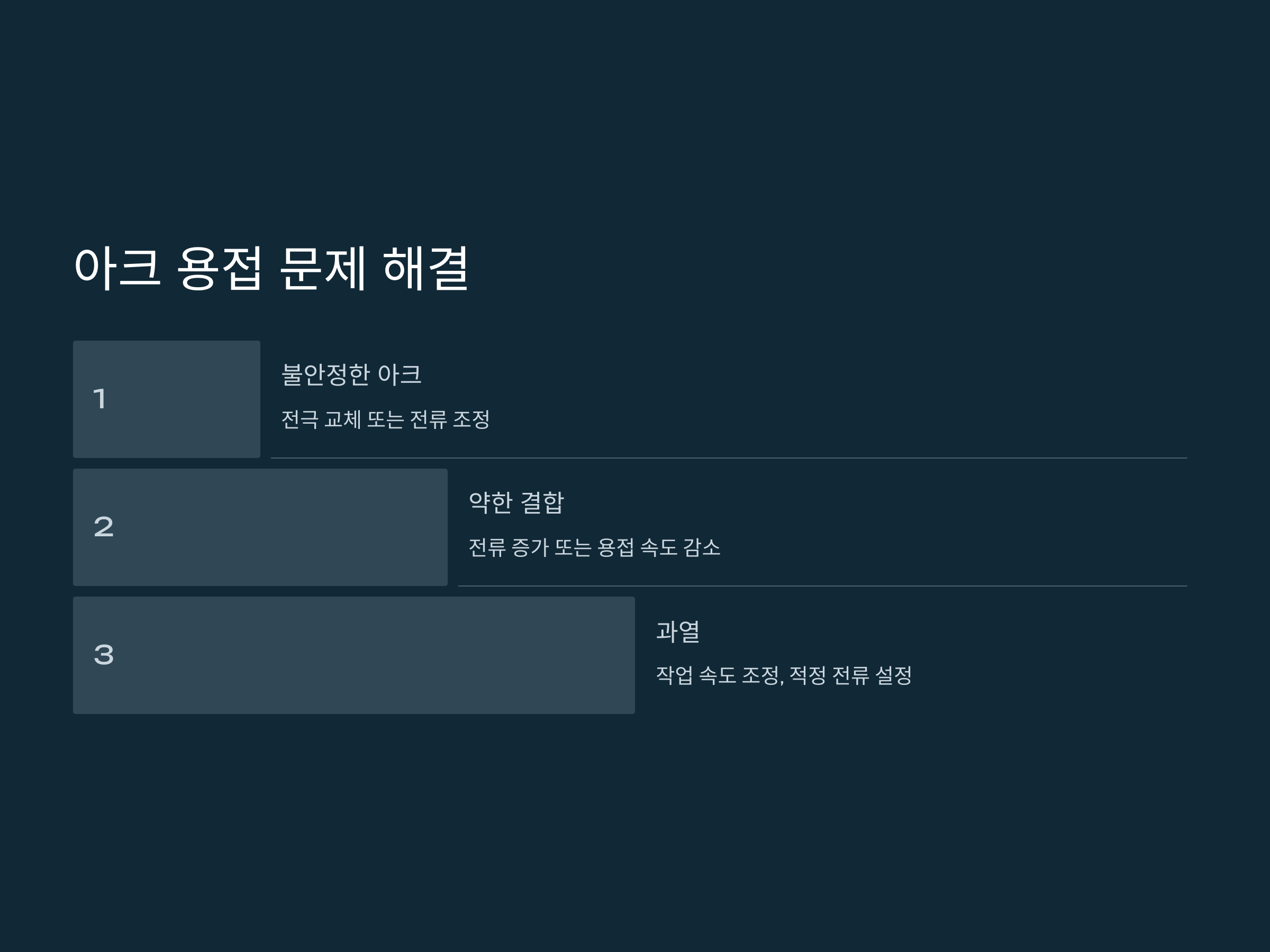 - 원인: 전극 상태 불량, 전류 설정 오류.