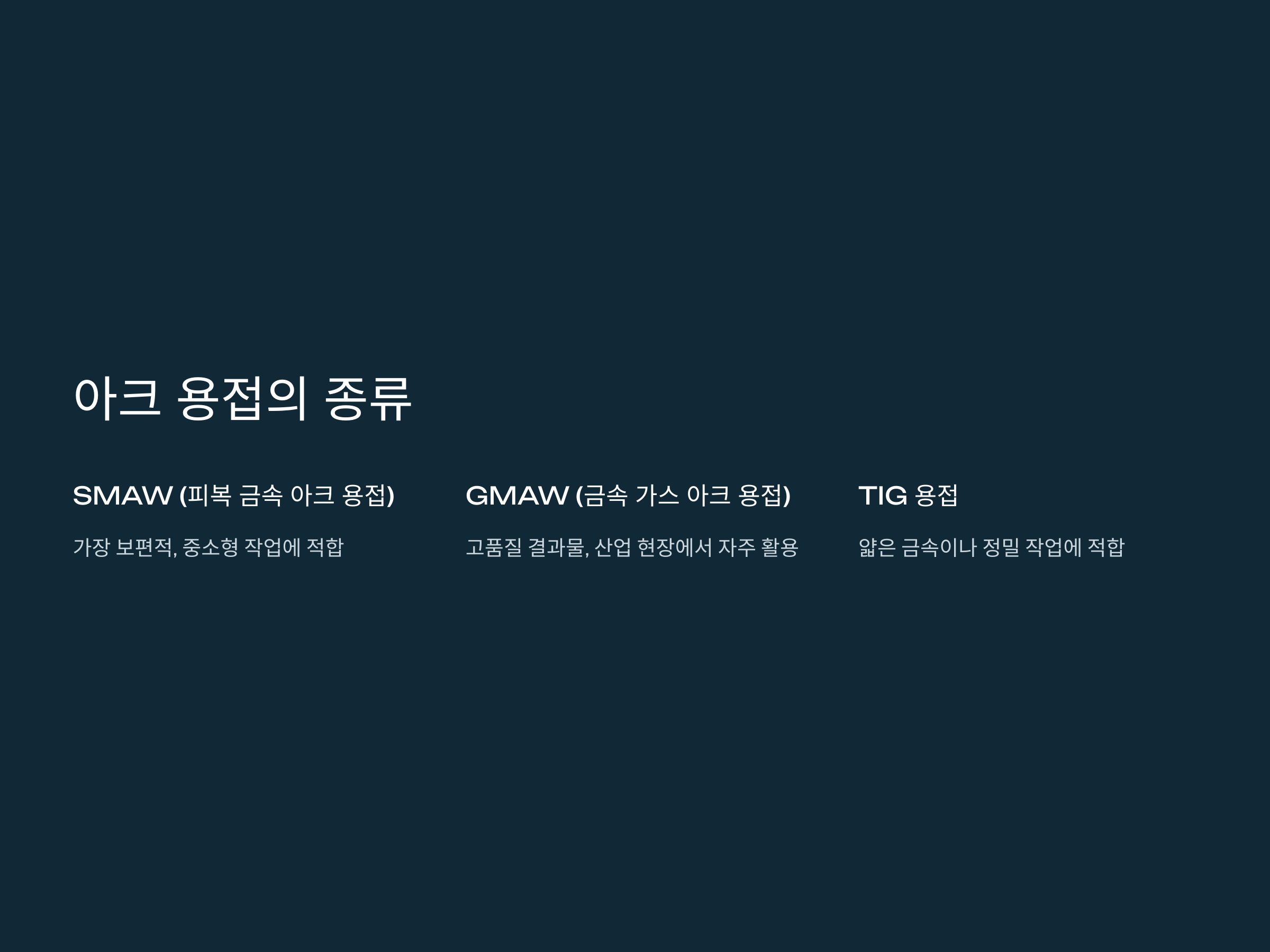 - SMAW(피복 금속 아크 용접): 가장 보편적이며, 중소형 작업에 적합합니다.