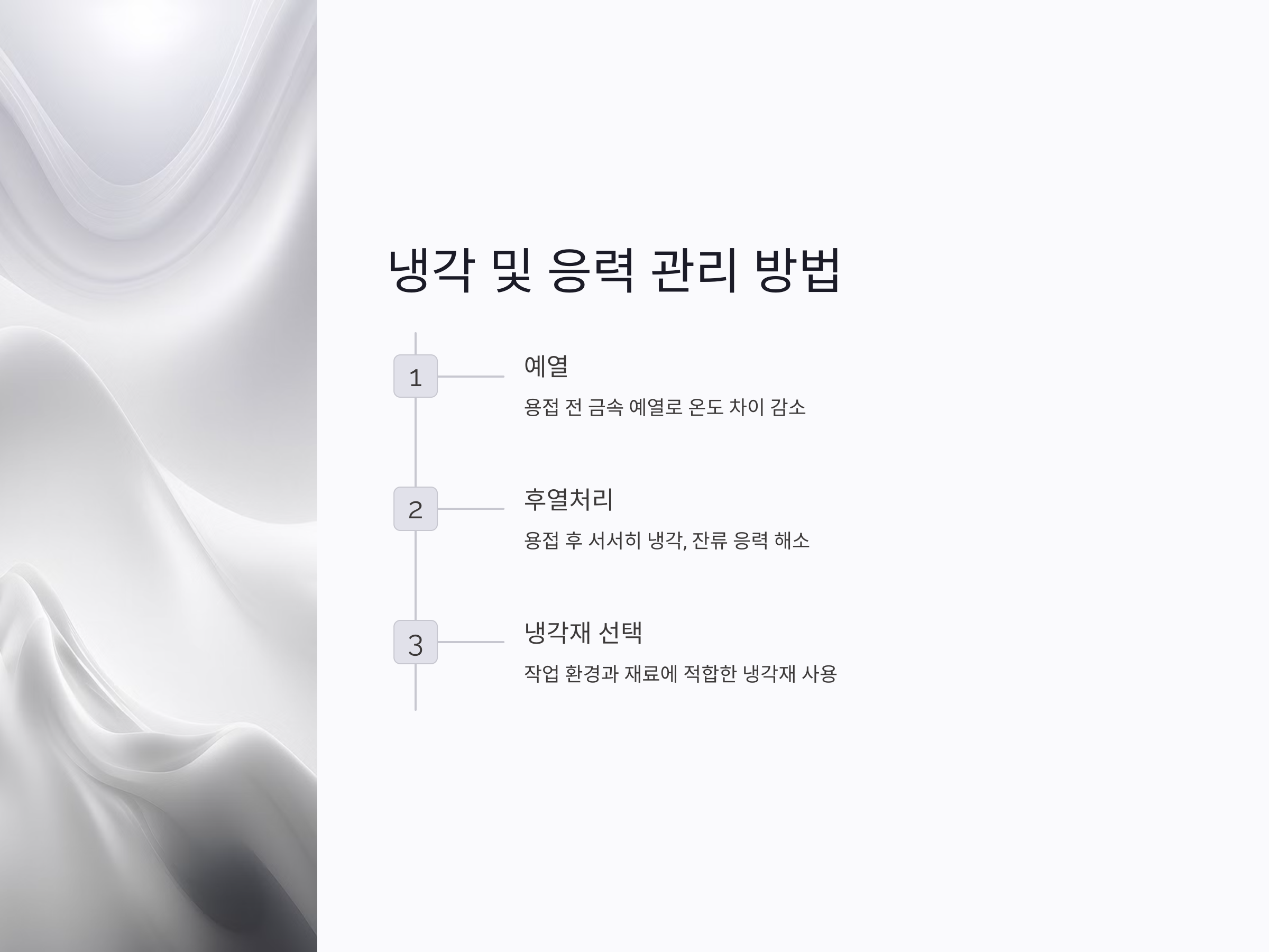- 예: 용접 후 급랭 시 균열 가능성이 증가하므로 냉각 속도를 조절하는 것이 중요합니다.