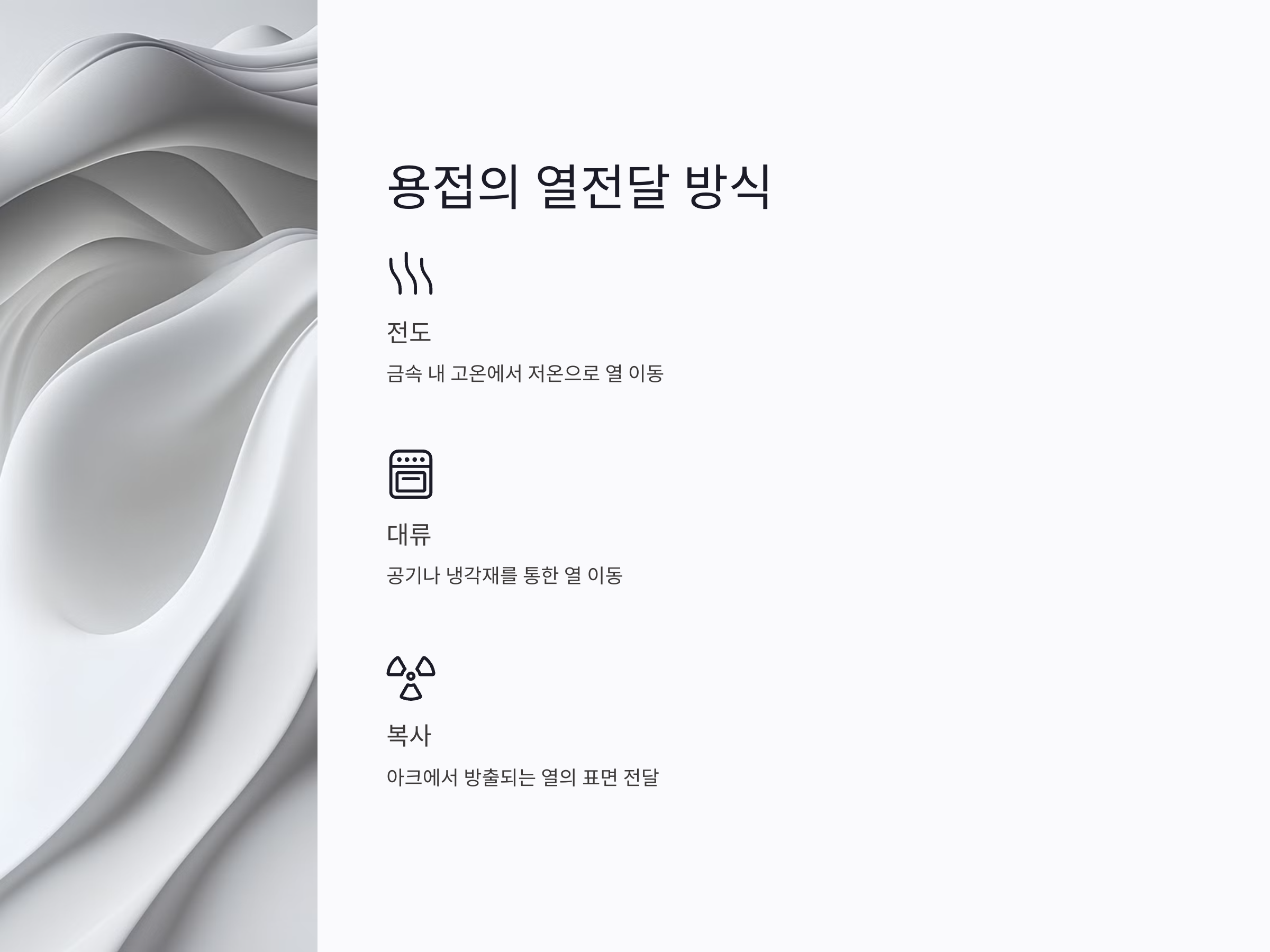 - 용접 부근의 공기나 냉각재를 통해 열이 이동하는 과정입니다.