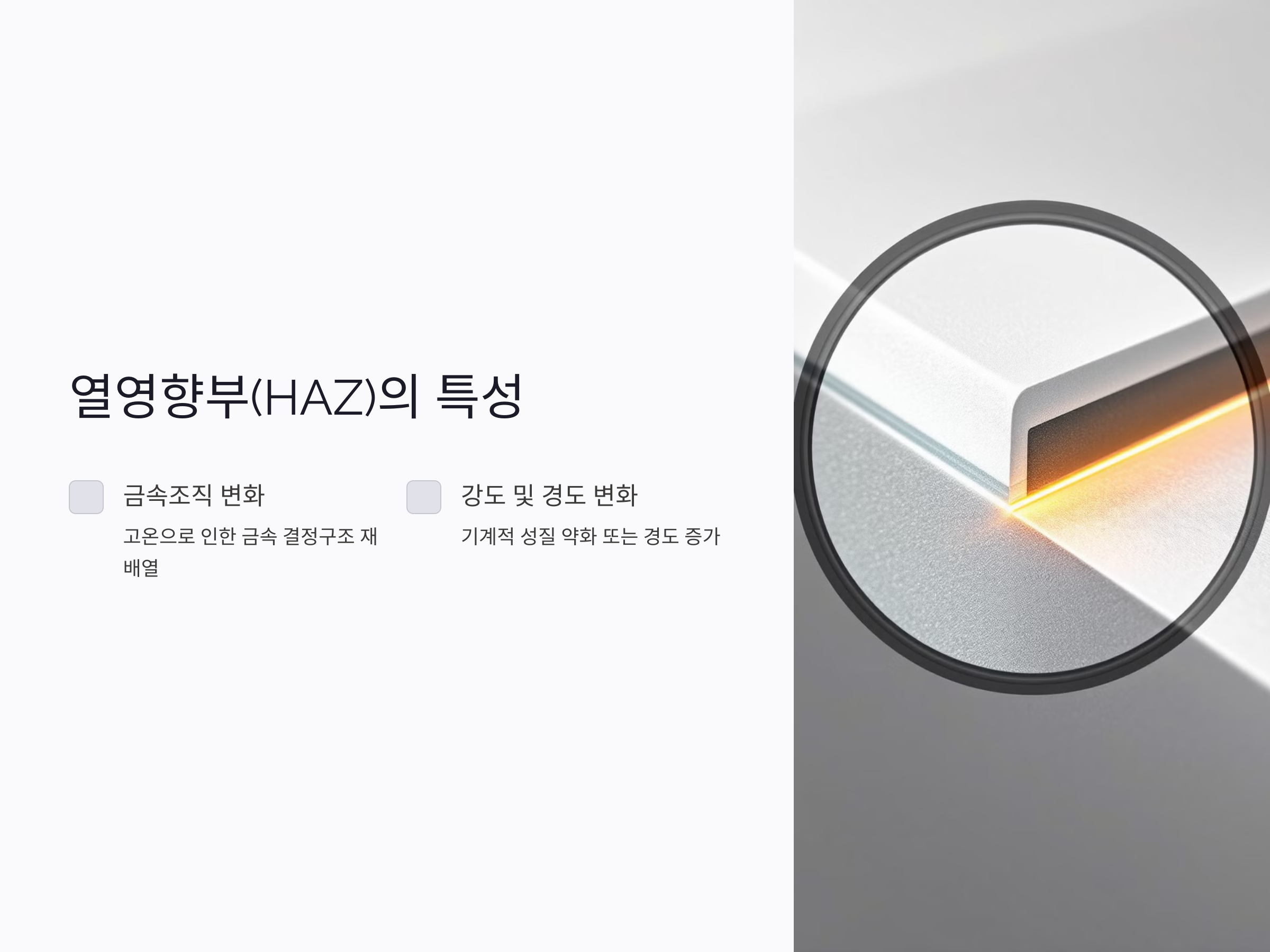 용접 시 발생하는 열은 용접부 인근의 금속 조직에도 변화를 일으킵니다. 이를 열영향부(HAZ)라 하며, 이 영역의 특성은 용접 품질에 중대한 영향을 미칩니다.