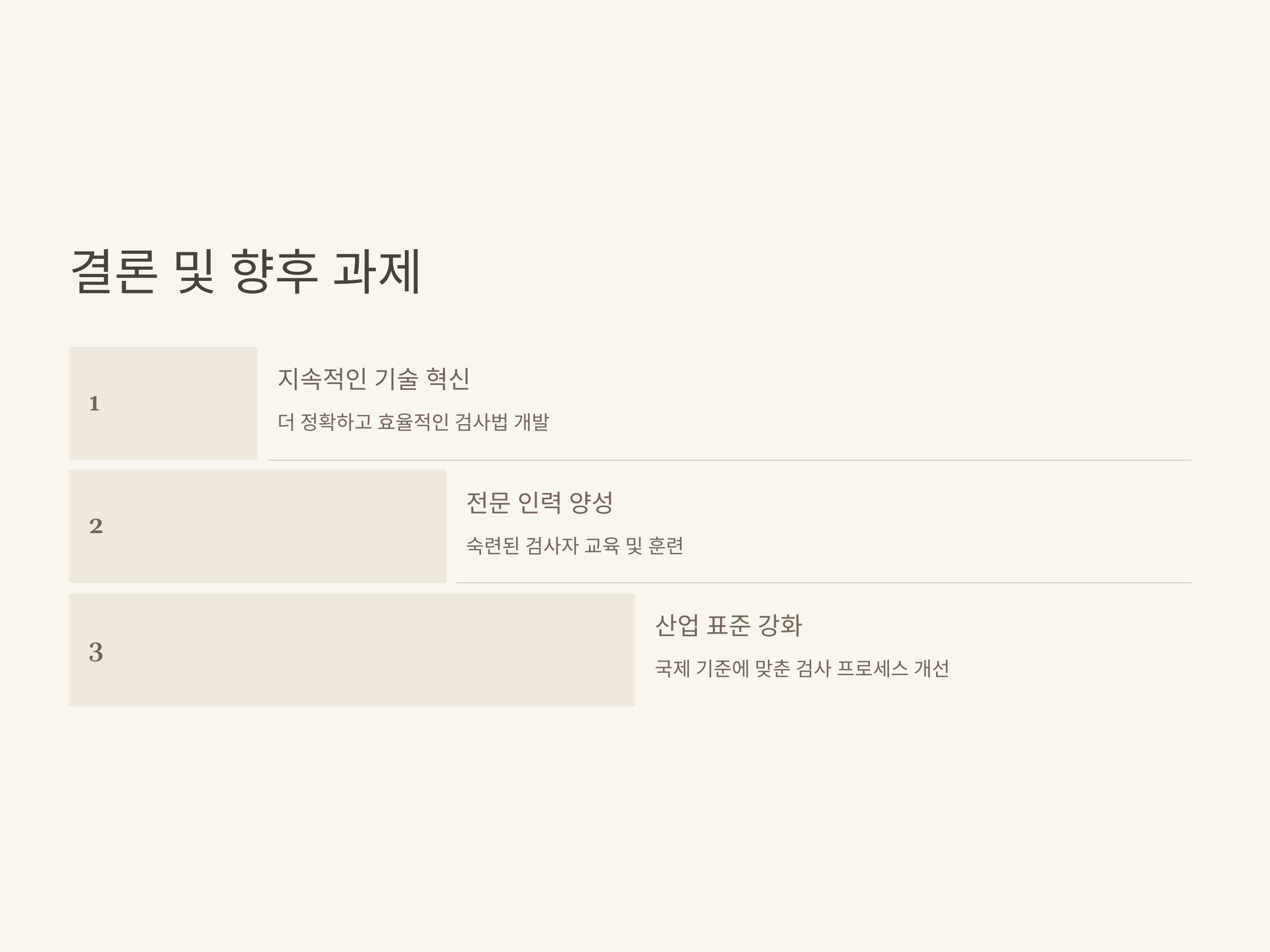 검사는 장비의 성능뿐 아니라 검사자의 경험과 기술력에 크게 의존합니다. 전문 교육과 자격증 취득을 통한 숙련도 향상이 필요합니다.