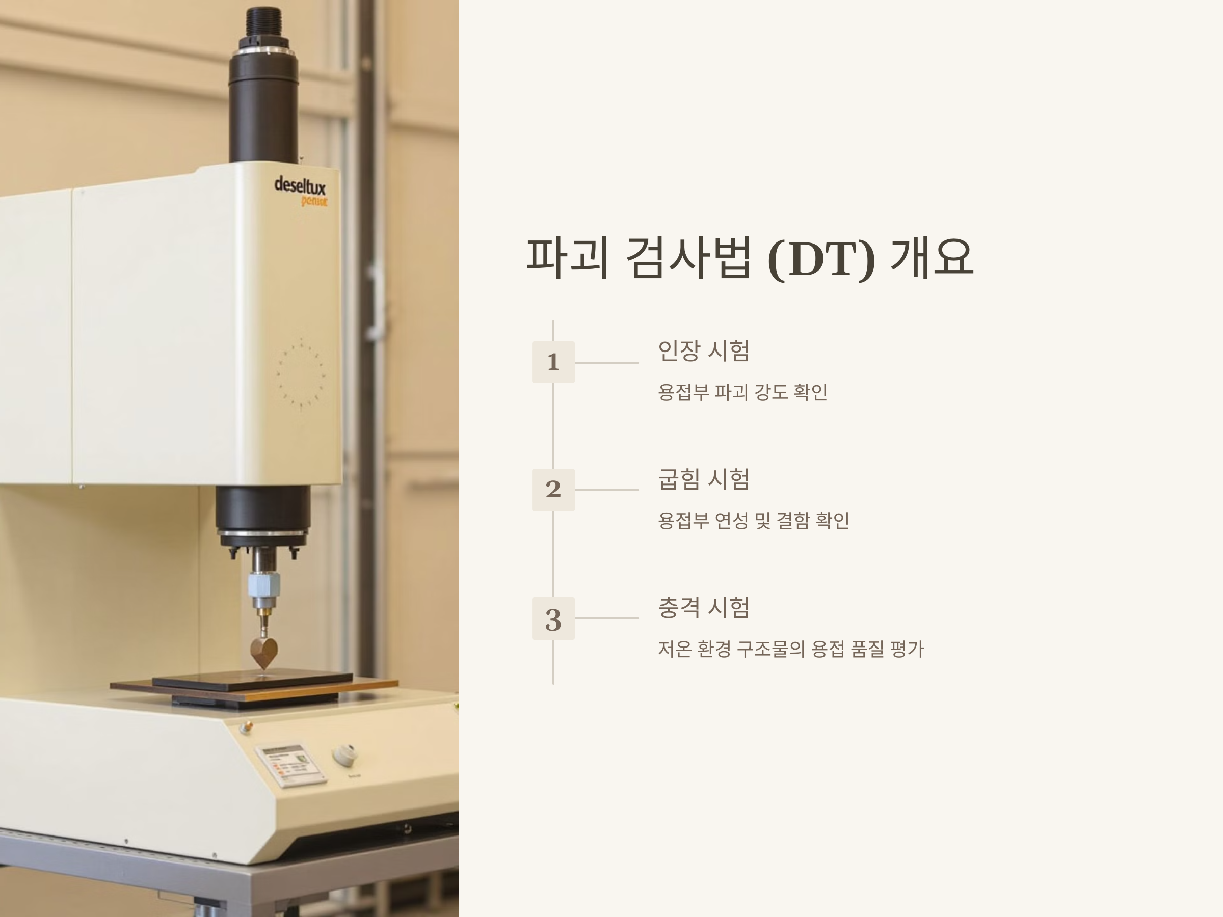 파괴 검사법은 시료를 파괴하여 결함을 확인하는 방법입니다. 비파괴 검사법보다 정밀한 분석이 가능하며, 용접 강도 평가에 주로 사용됩니다.