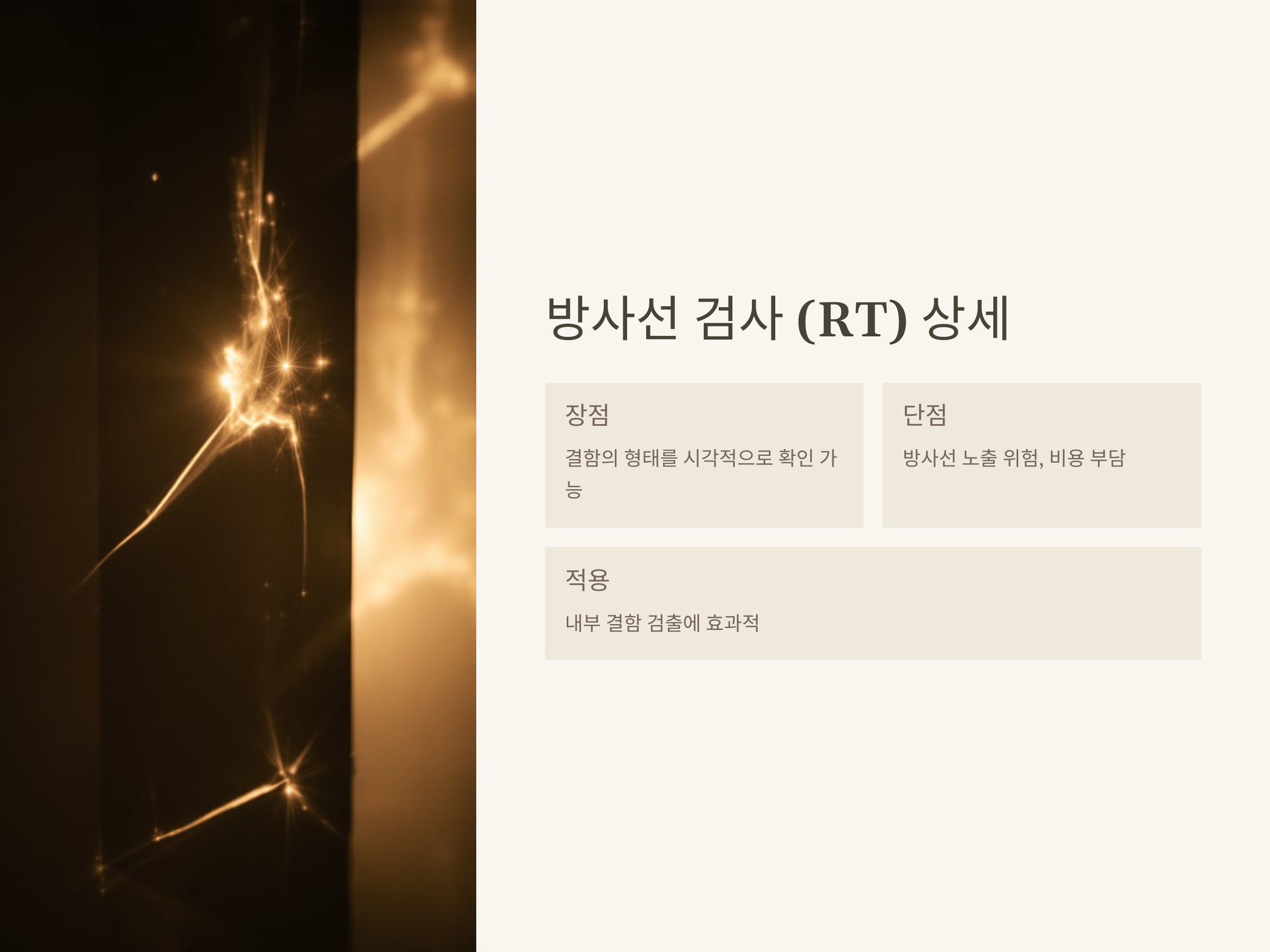 X선이나 감마선을 이용해 내부 결함을 검출합니다. 필름이나 디지털 이미지를 통해 결함을 시각적으로 확인할 수 있습니다.