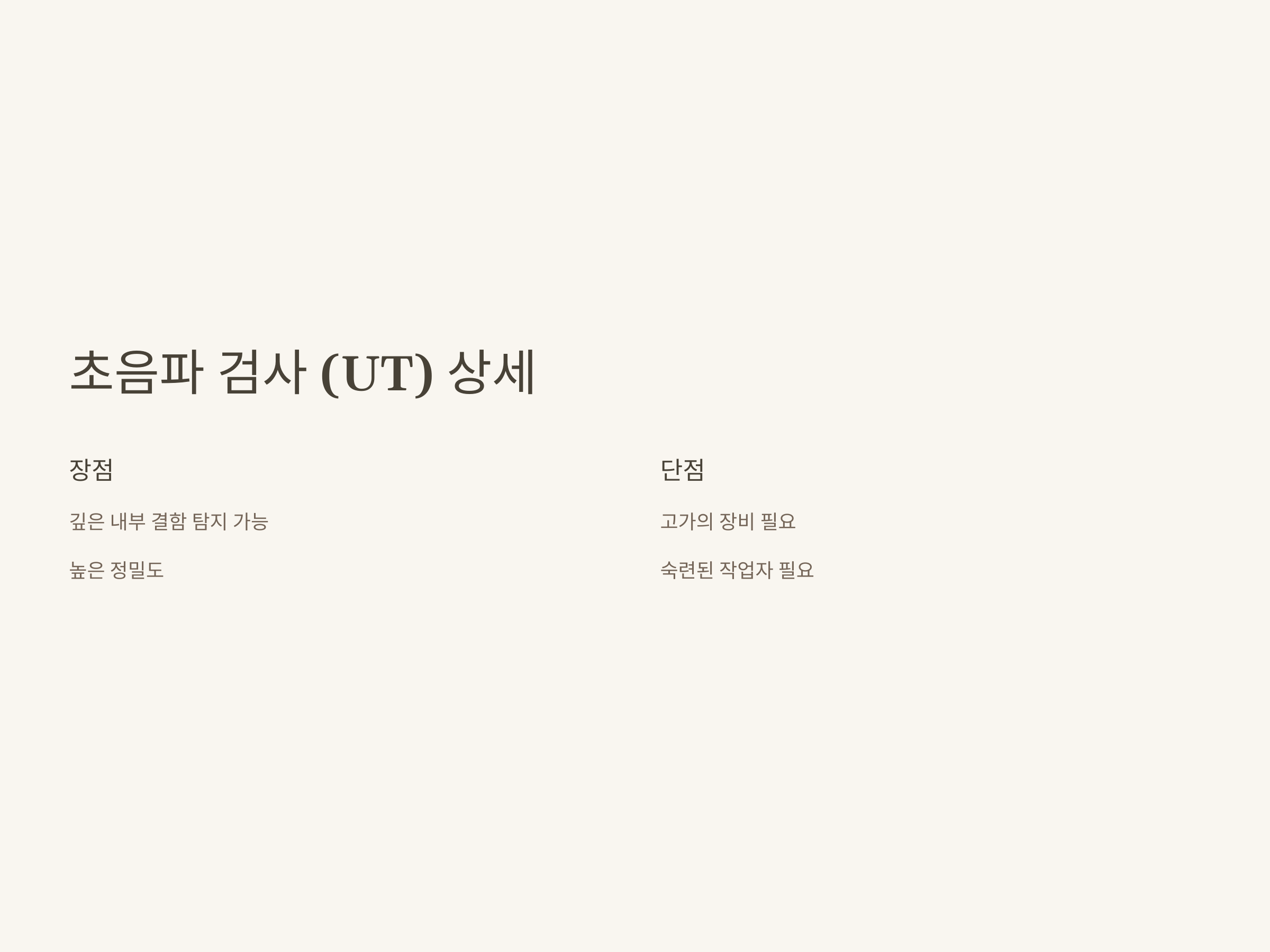 - 장점: 깊은 내부 결함 탐지 가능, 높은 정밀도.