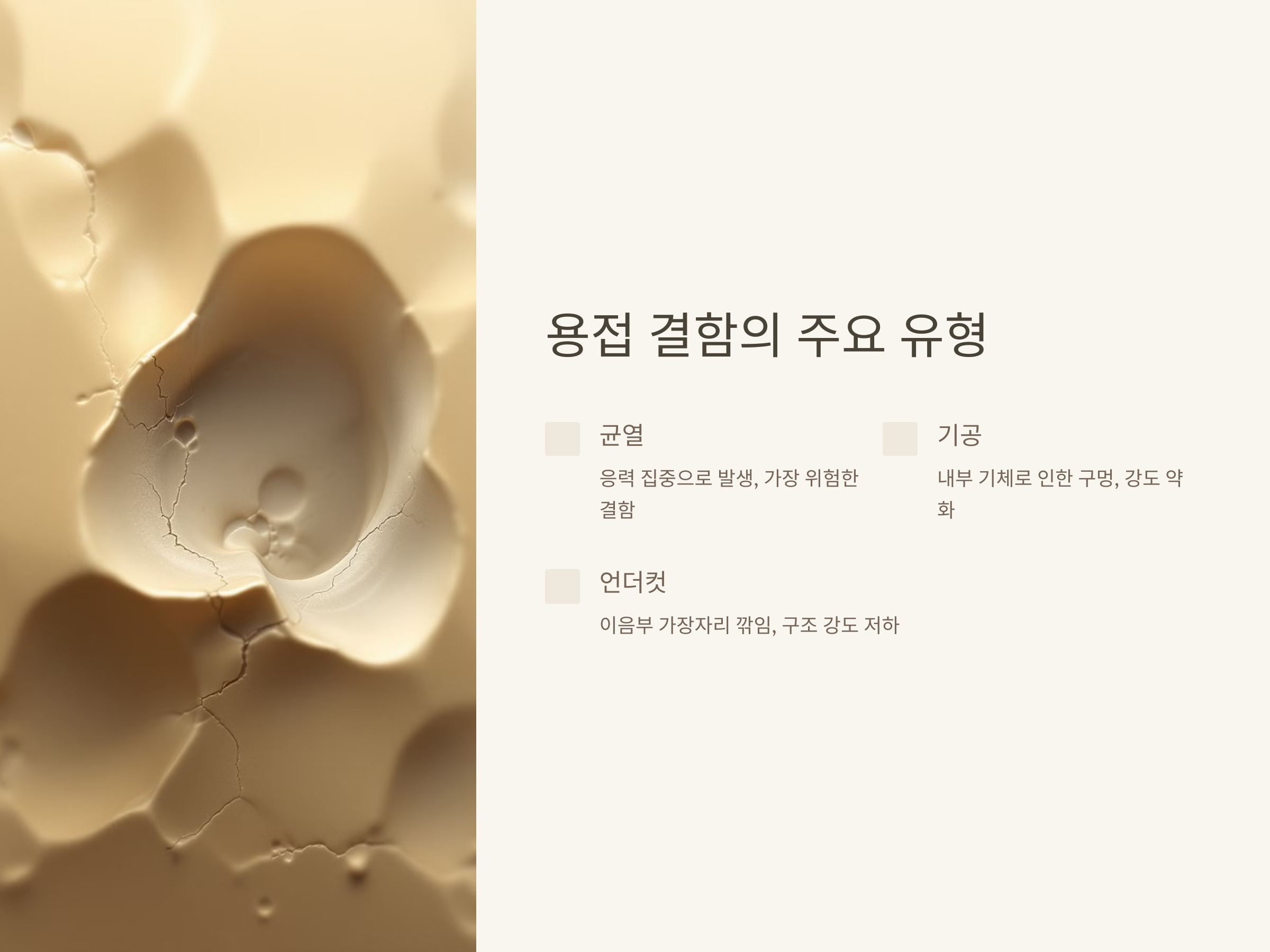 용접 과정에서 응력의 집중이나 냉각 속도의 차이로 인해 발생하는 결함입니다. 균열은 용접 구조물의 파손 원인이 되므로 가장 위험한 결함으로 간주됩니다.
