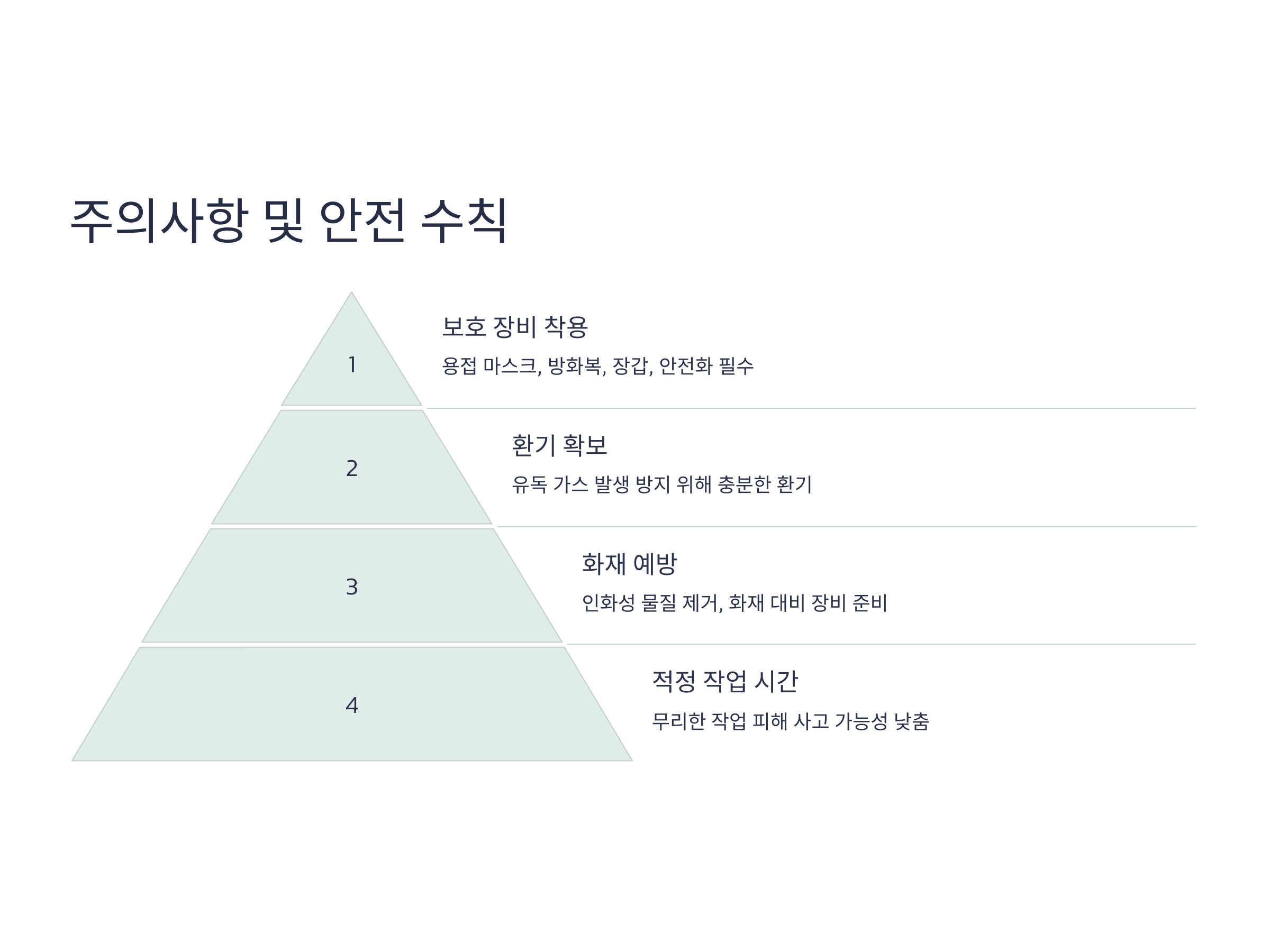 - 보호 장비 착용: 용접 마스크, 방화복, 장갑, 안전화를 반드시 착용합니다.