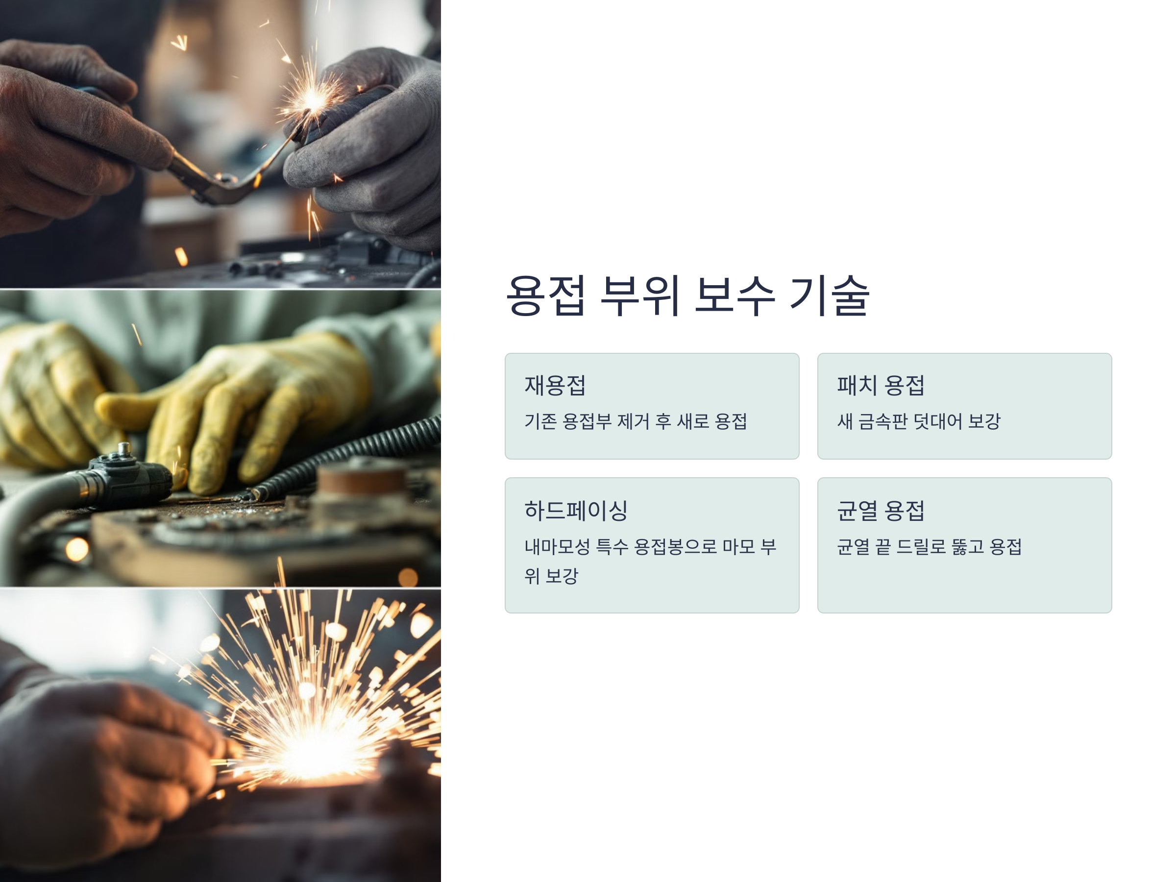 - 패치 용접: 손상 부위에 새로운 금속판을 덧대어 보강합니다. 얇은 금속 부위에 유용합니다.
