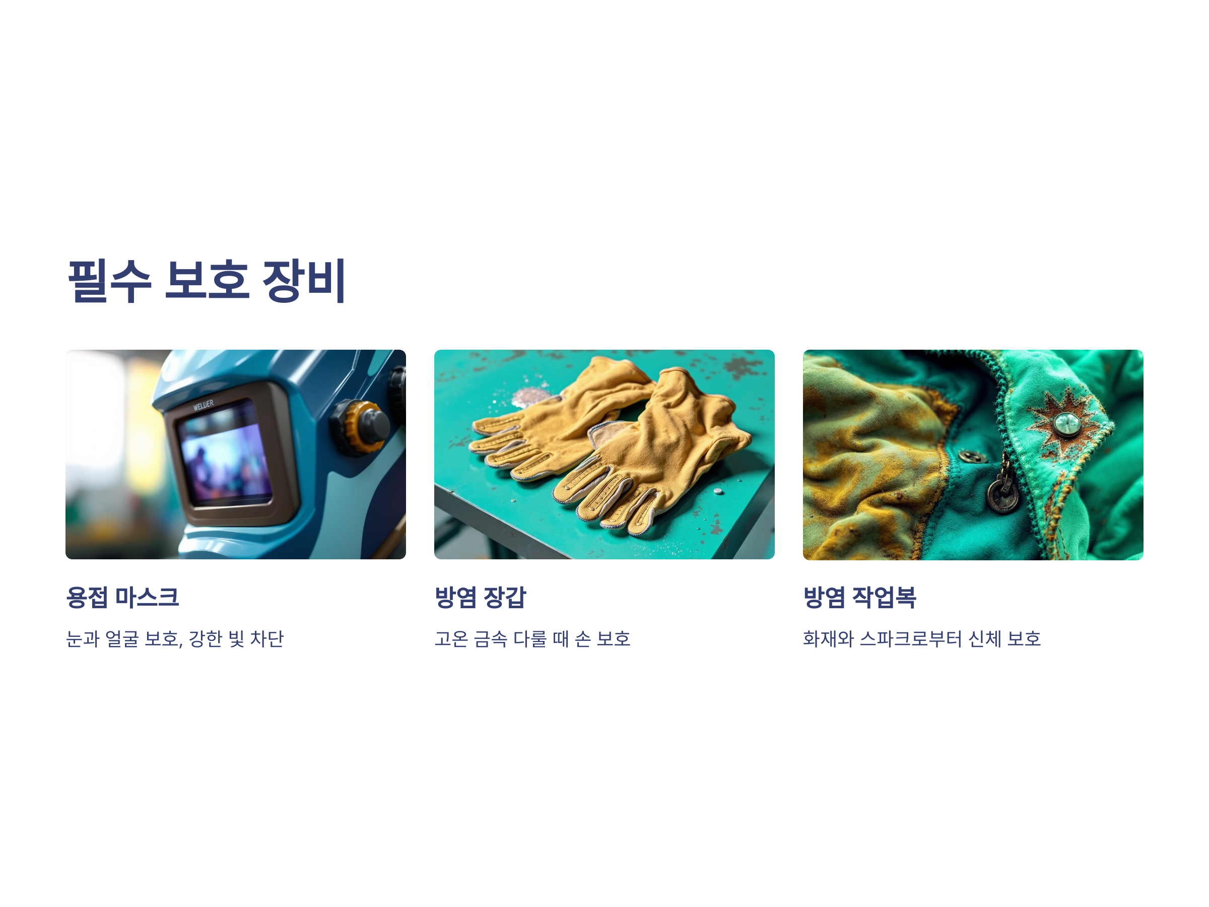 - 용접 마스크: 눈과 얼굴을 보호하며, 용접 중 발생하는 강력한 빛과 스파크를 막아줍니다.