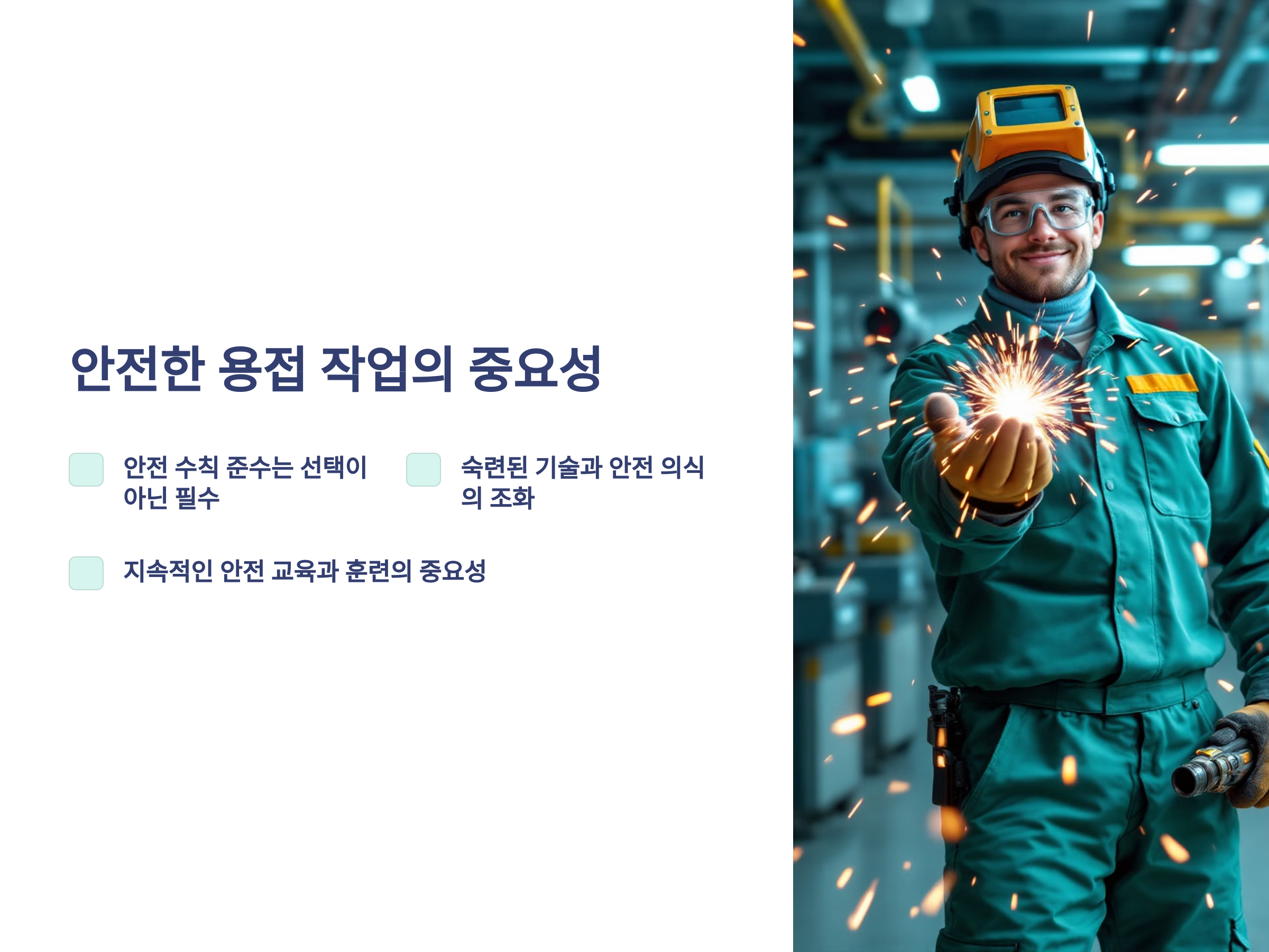 - 정기적인 안전 교육과 훈련을 통해 용접 장비 사용법과 사고 대처 능력을 익히세요.