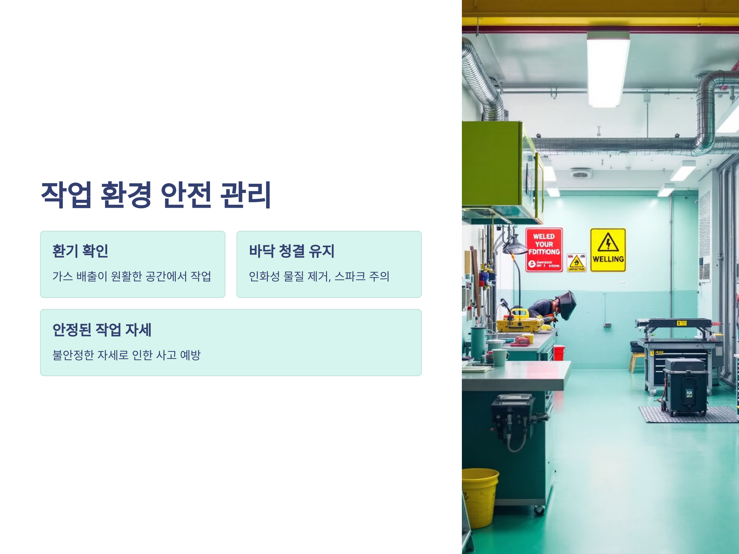 - 작업 공간 정리: 인화성 물질을 용접 작업 공간에서 치우고, 불꽃이 튀지 않도록 조치합니다.