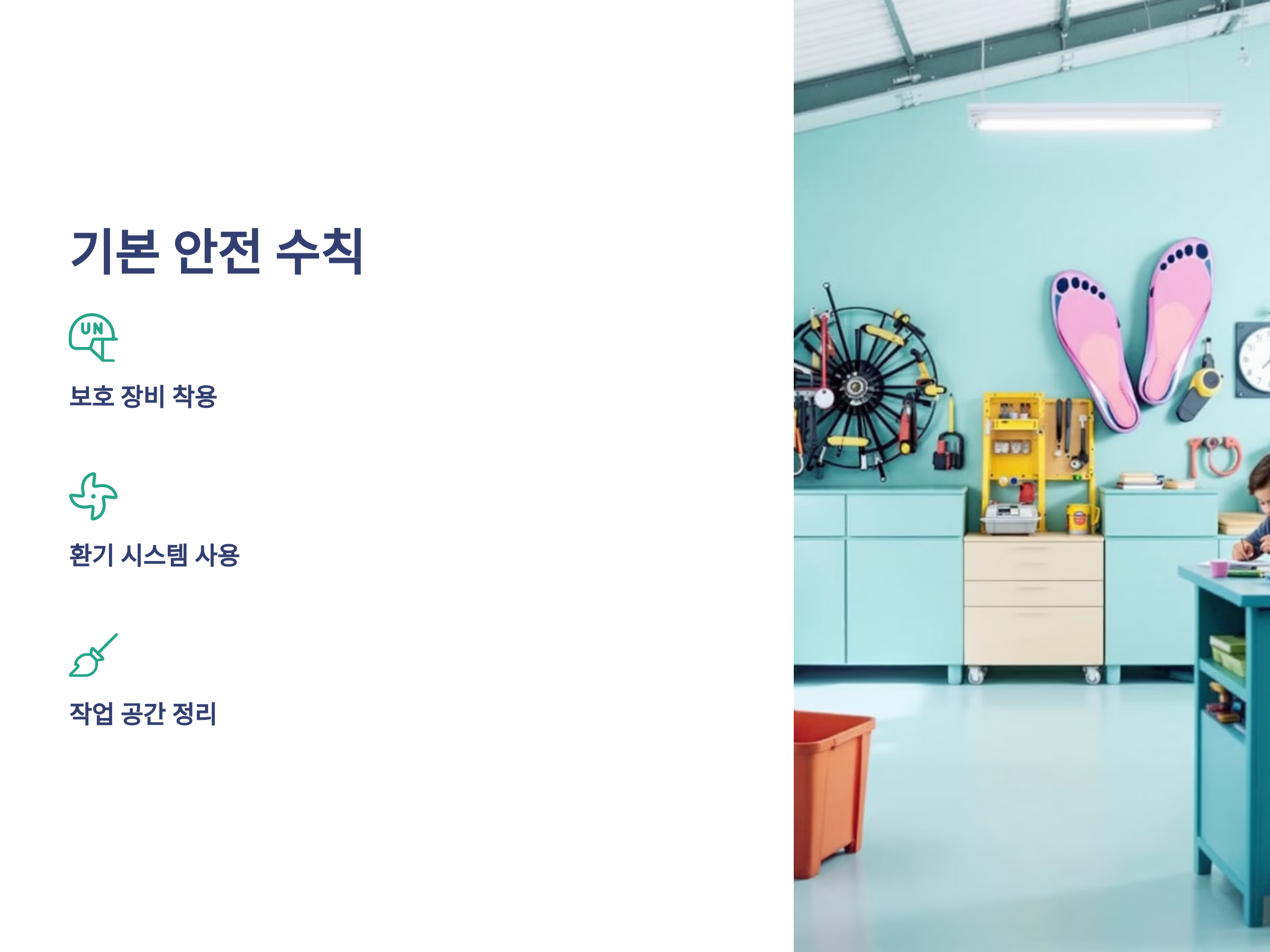 - 응급 조치 장비 준비: 소화기, 응급 구급 세트를 가까운 곳에 배치하세요.