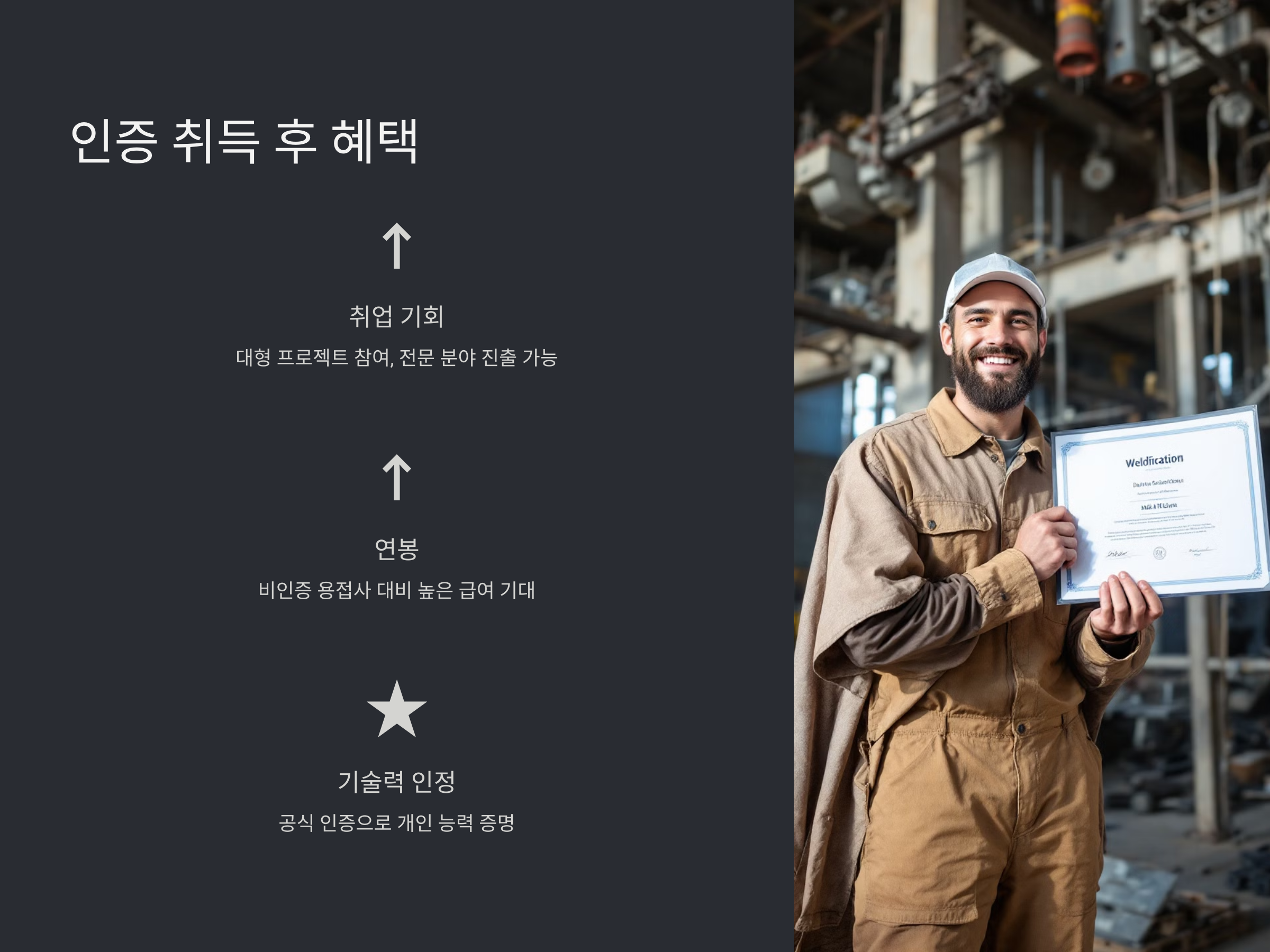 - 연봉 상승: 인증된 용접사는 비인증 용접사보다 높은 급여를 받을 가능성이 높습니다.