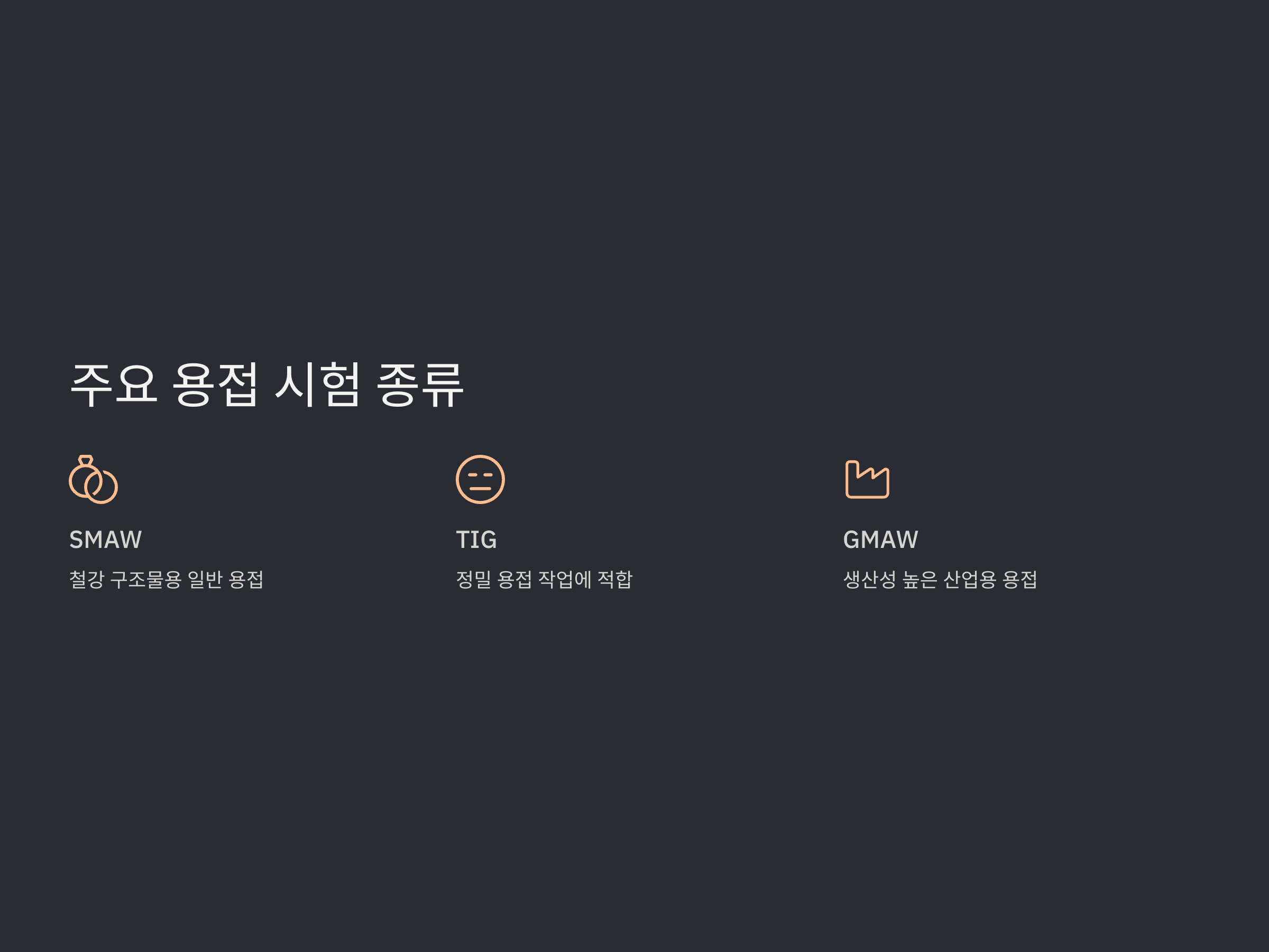 용접 인증 시험은 용접사의 기술력과 안전성을 검증하기 위해 도입된 절차로, 국가별 혹은 산업별로 규정이 다를 수 있습니다. 주로 사용되는 시험 종류는 다음과 같습니다: