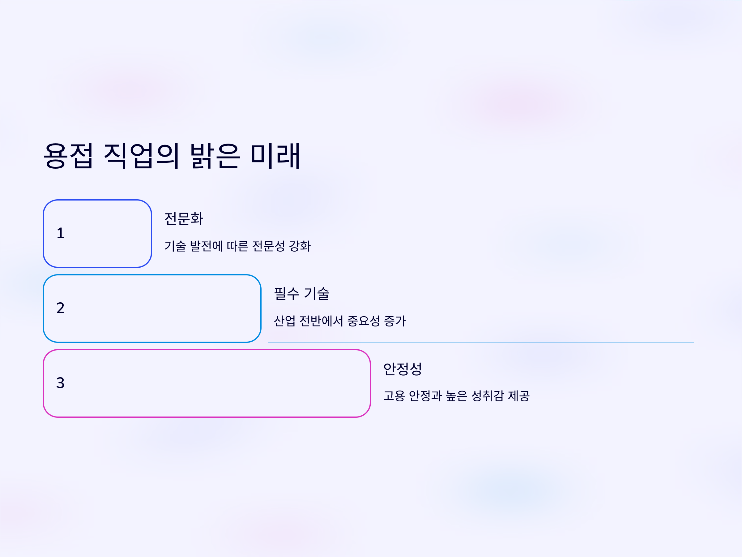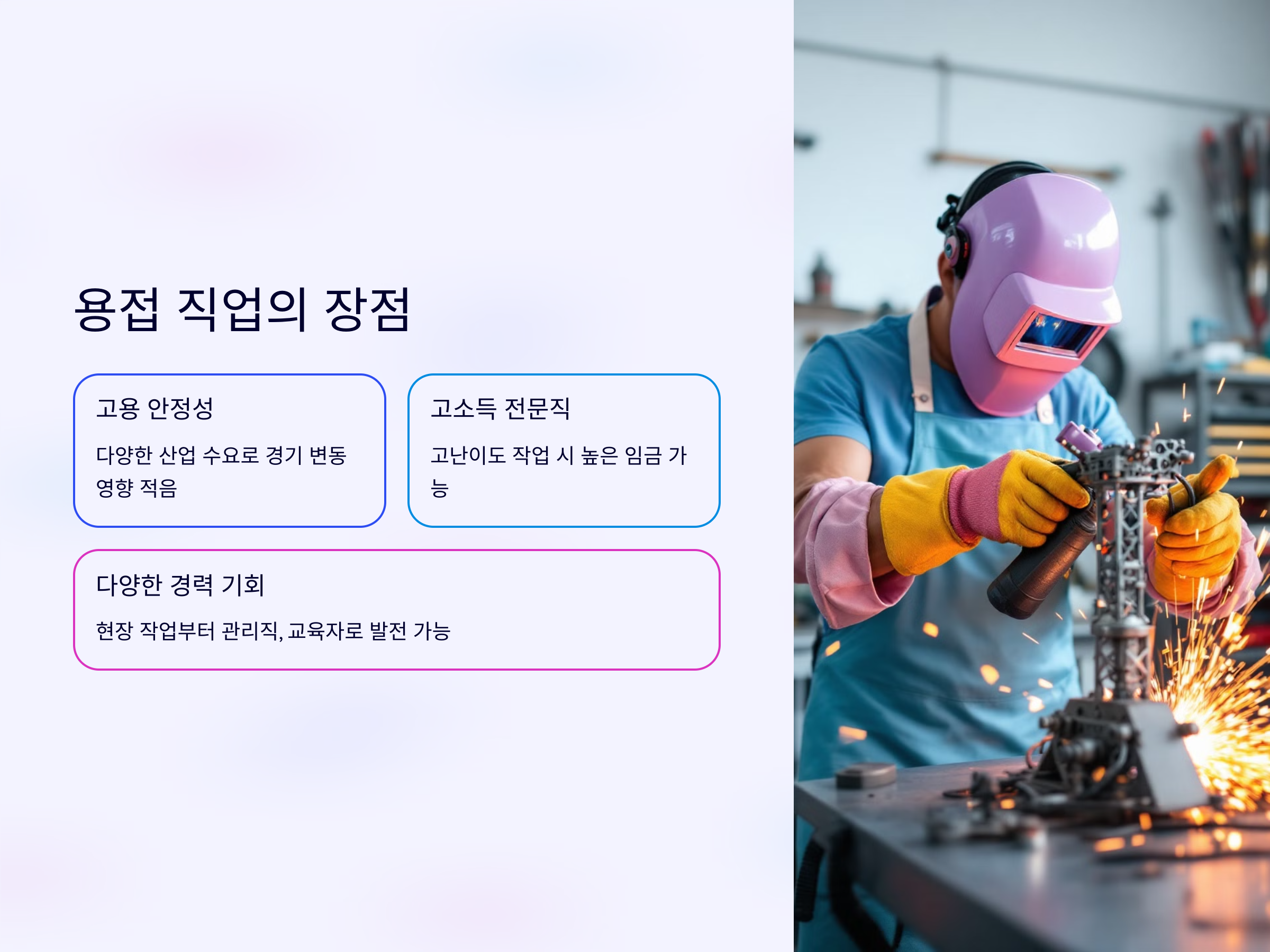 - 다양한 경력 기회: 현장 작업부터 관리직, 교육자, 또는 용접 기술 연구원으로도 발전 가능성이 열려 있습니다.