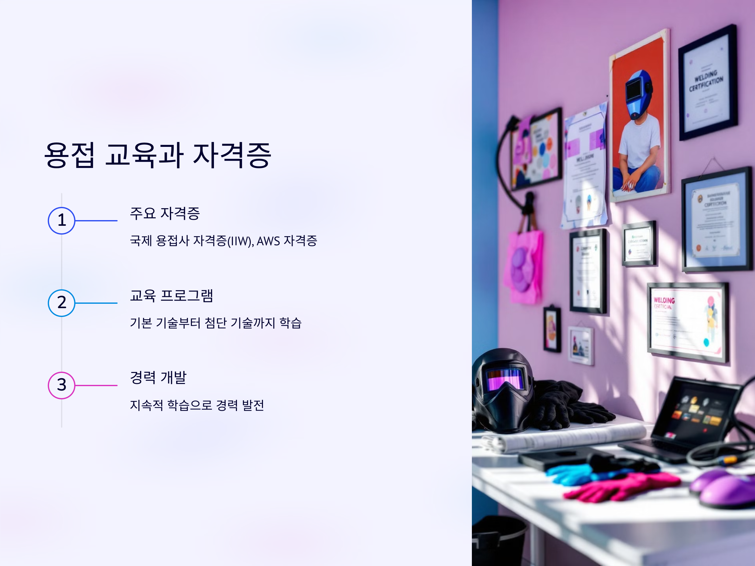 - 주요 자격증: 국제 용접사 자격증(IIW), 미국 용접협회(AWS) 자격증 등이 대표적입니다.