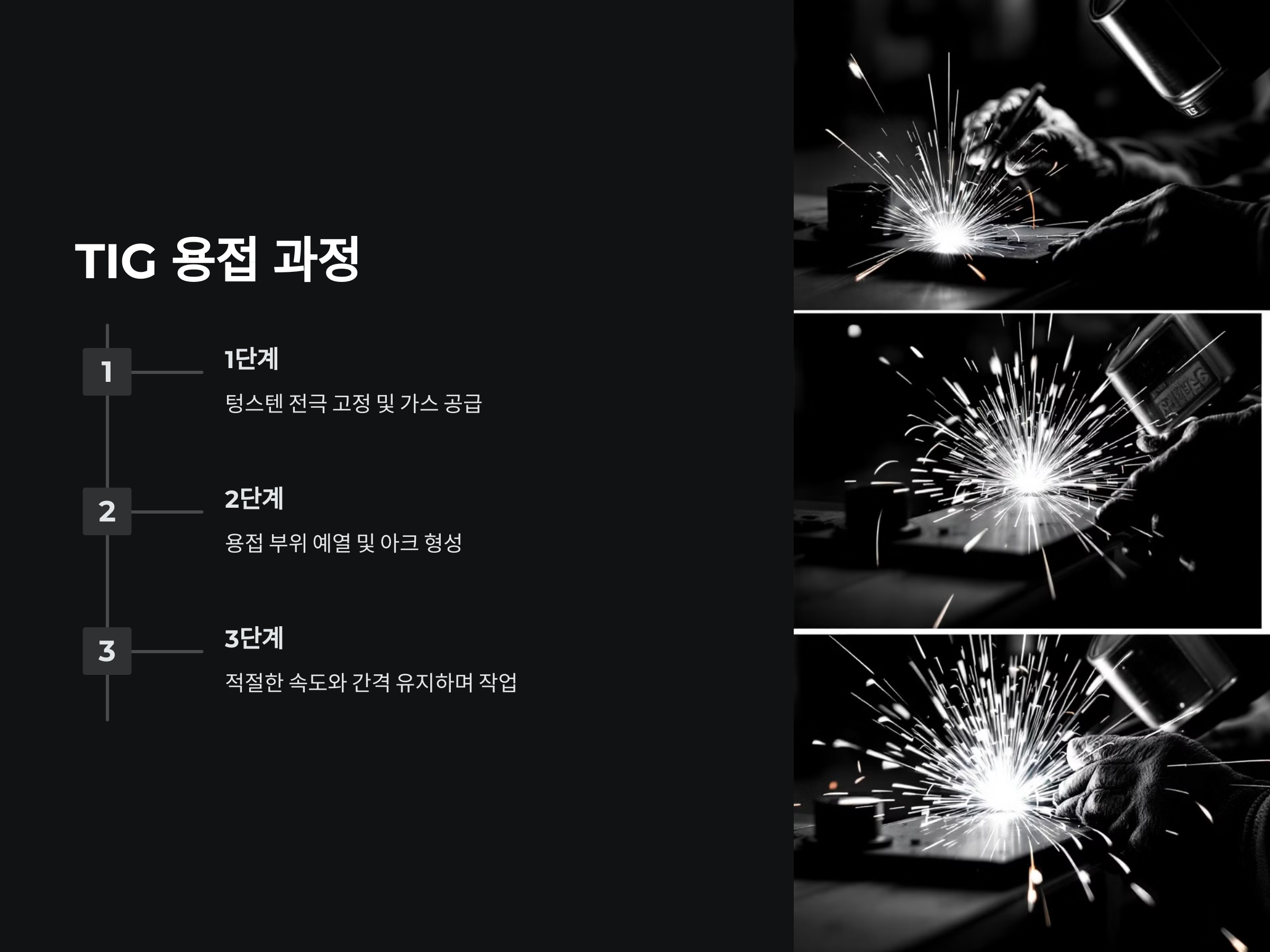 TIG 용접(Tungsten Inert Gas Welding)은 텅스텐 전극과 아르곤 등 비활성 가스를 사용하는 용접 방식으로, 정확하고 깔끔한 용접 결과물을 얻을 수 있는 것이 특징입니다. 이 방식은 주로 스테인리스강, 알루미늄, 구리와 같은 금속에 사용됩니다.