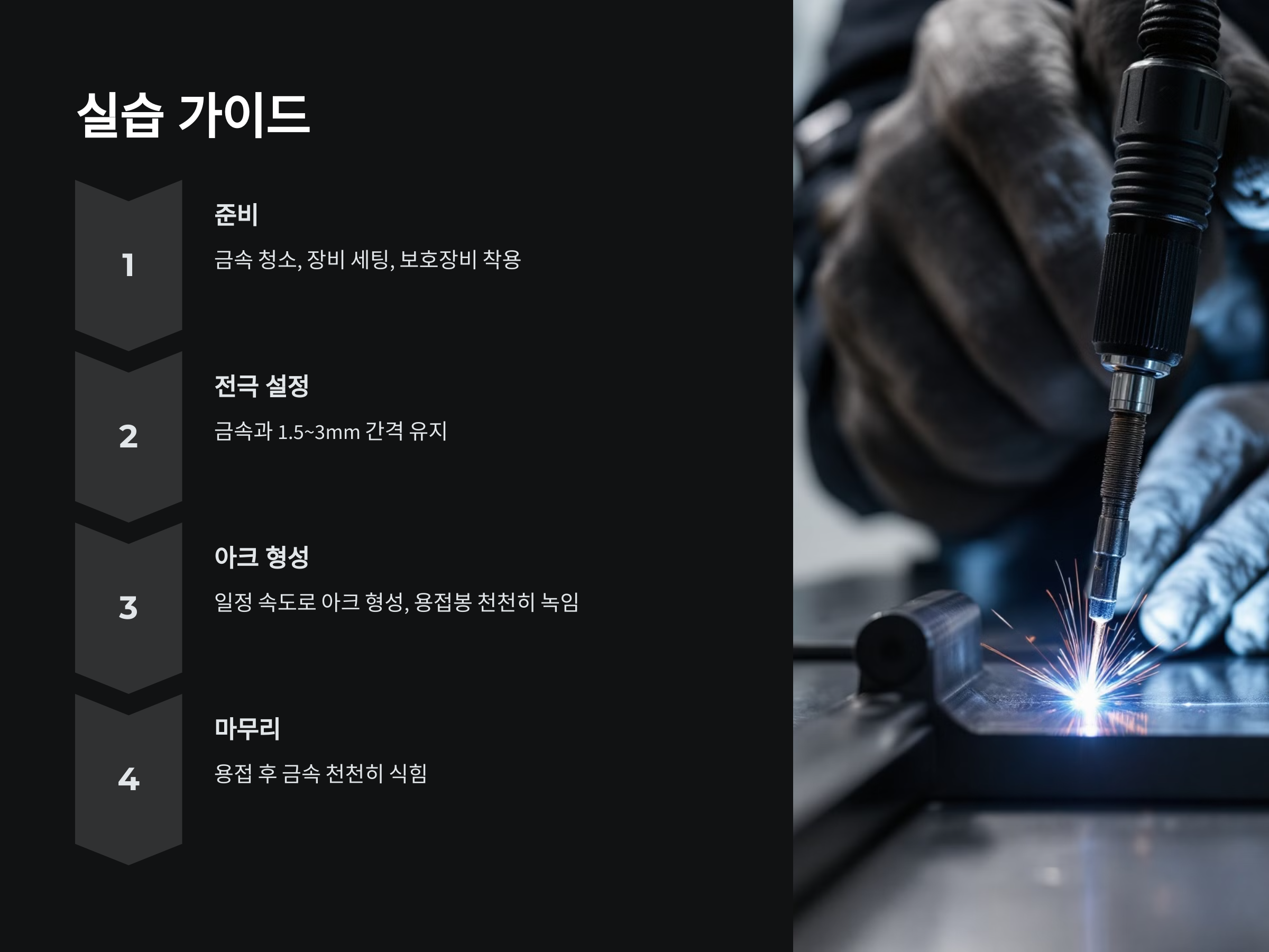 - 일정한 속도로 아크를 형성하고, 용접봉을 천천히 녹이며 움직입니다.