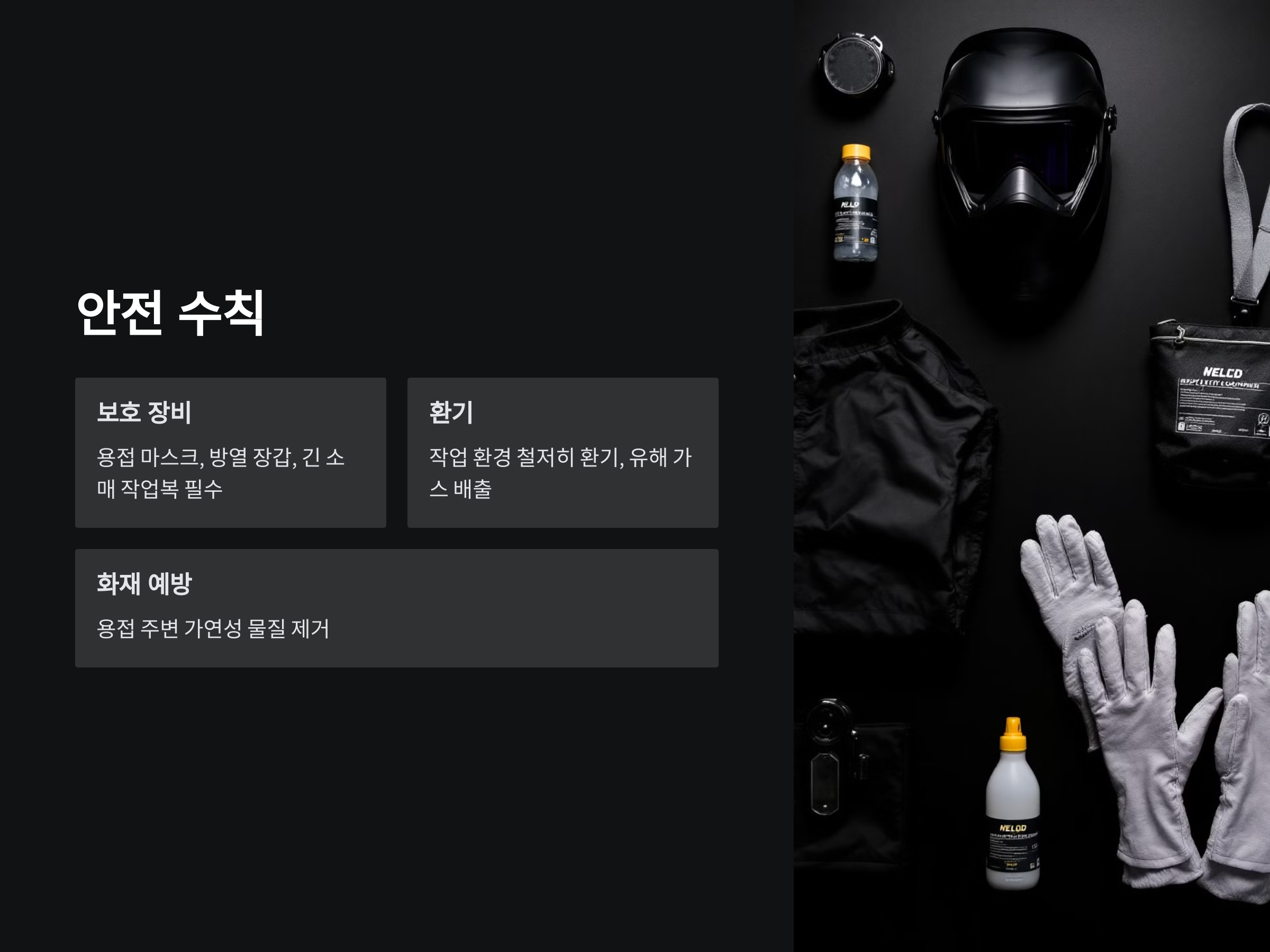 용접 작업은 항상 안전이 최우선입니다. 다음의 안전 수칙을 엄수하세요.