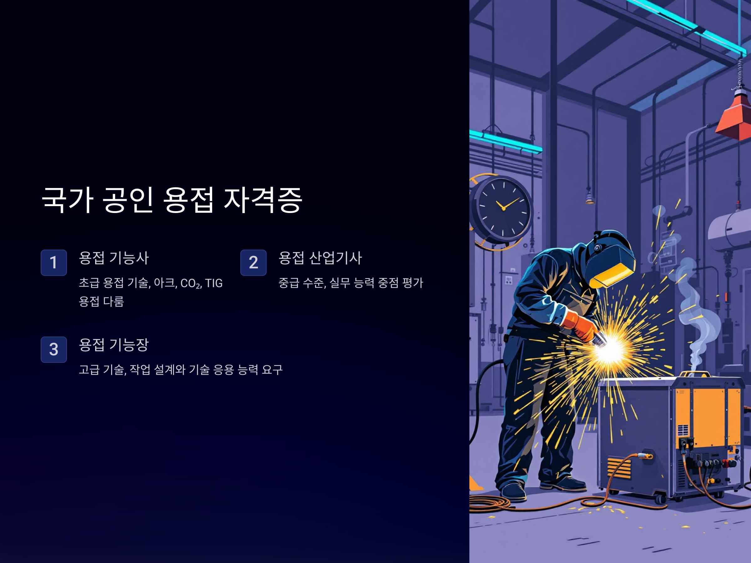 국가 공인 자격증은 고용노동부 또는 관련 기관에서 인증하는 자격으로, 국내 취업에 필수적입니다. 다음은 주요 국가 공인 용접 자격증입니다.
